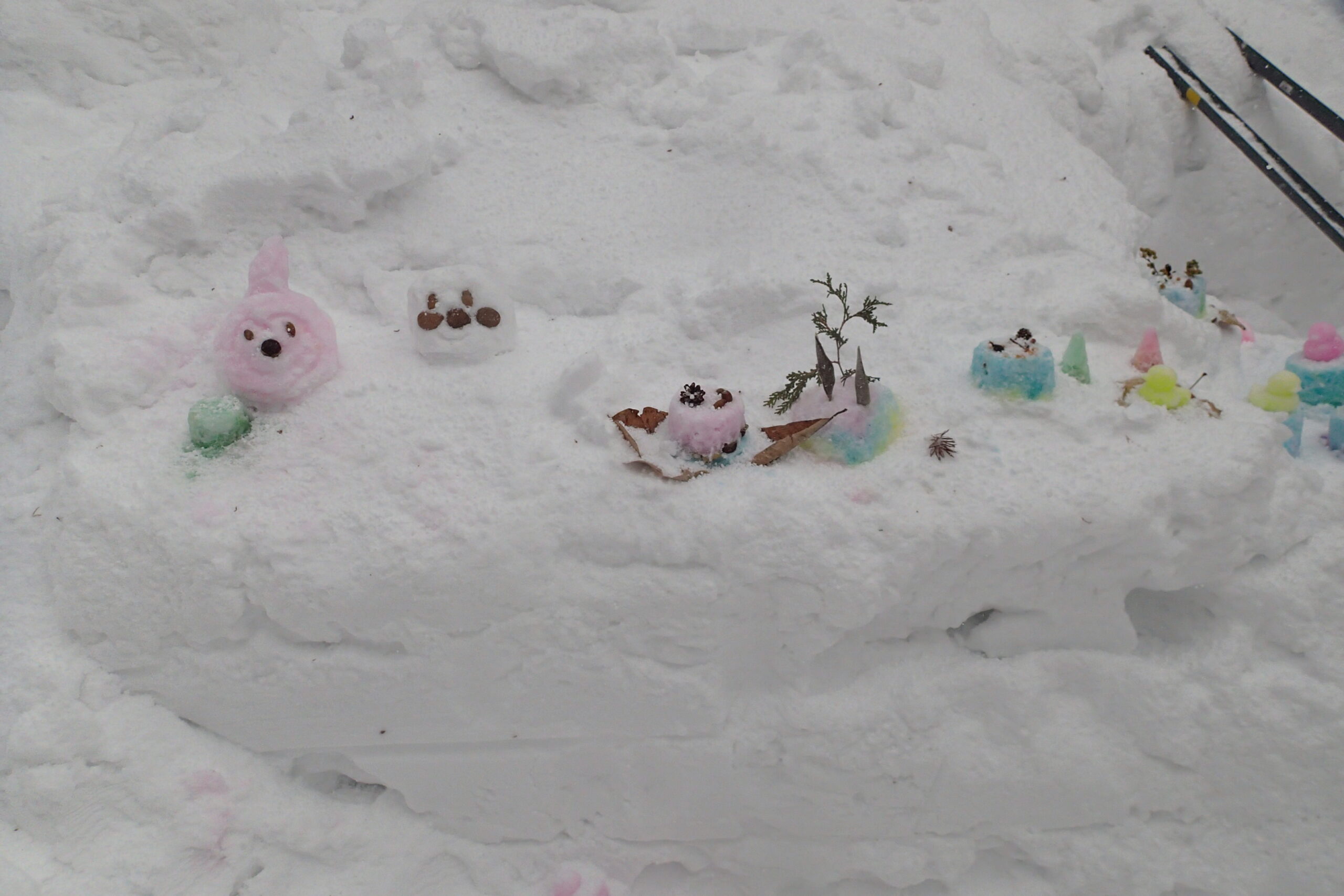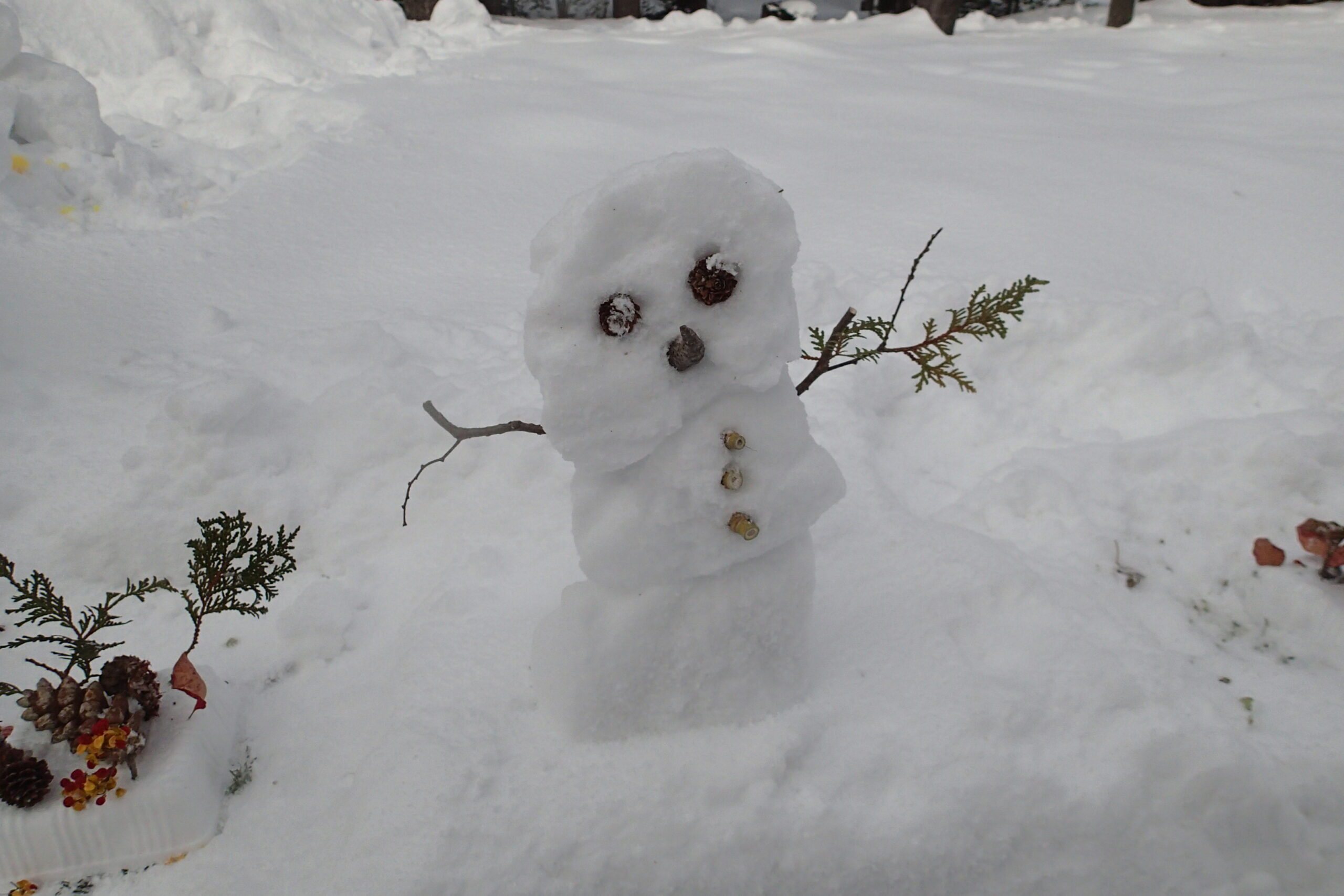 キャンドルのともる園路には遊びに来てくれたお客さんやボランティアさんたちが雪だるまやスノーケーキで飾りつけしてくれました。