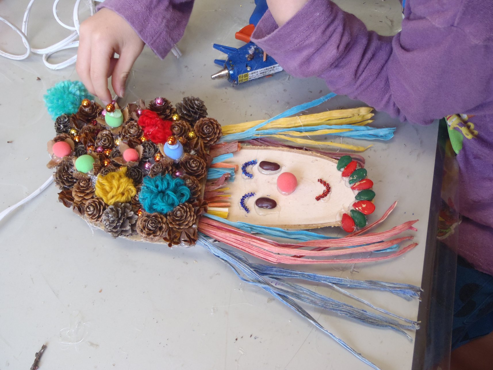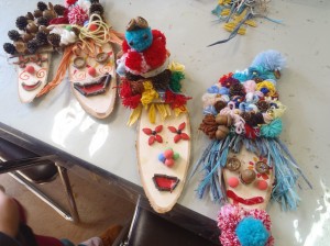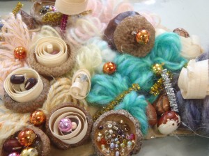 ↑この写真は、ピエロの帽子。木や木の実、ビーズや毛糸など、