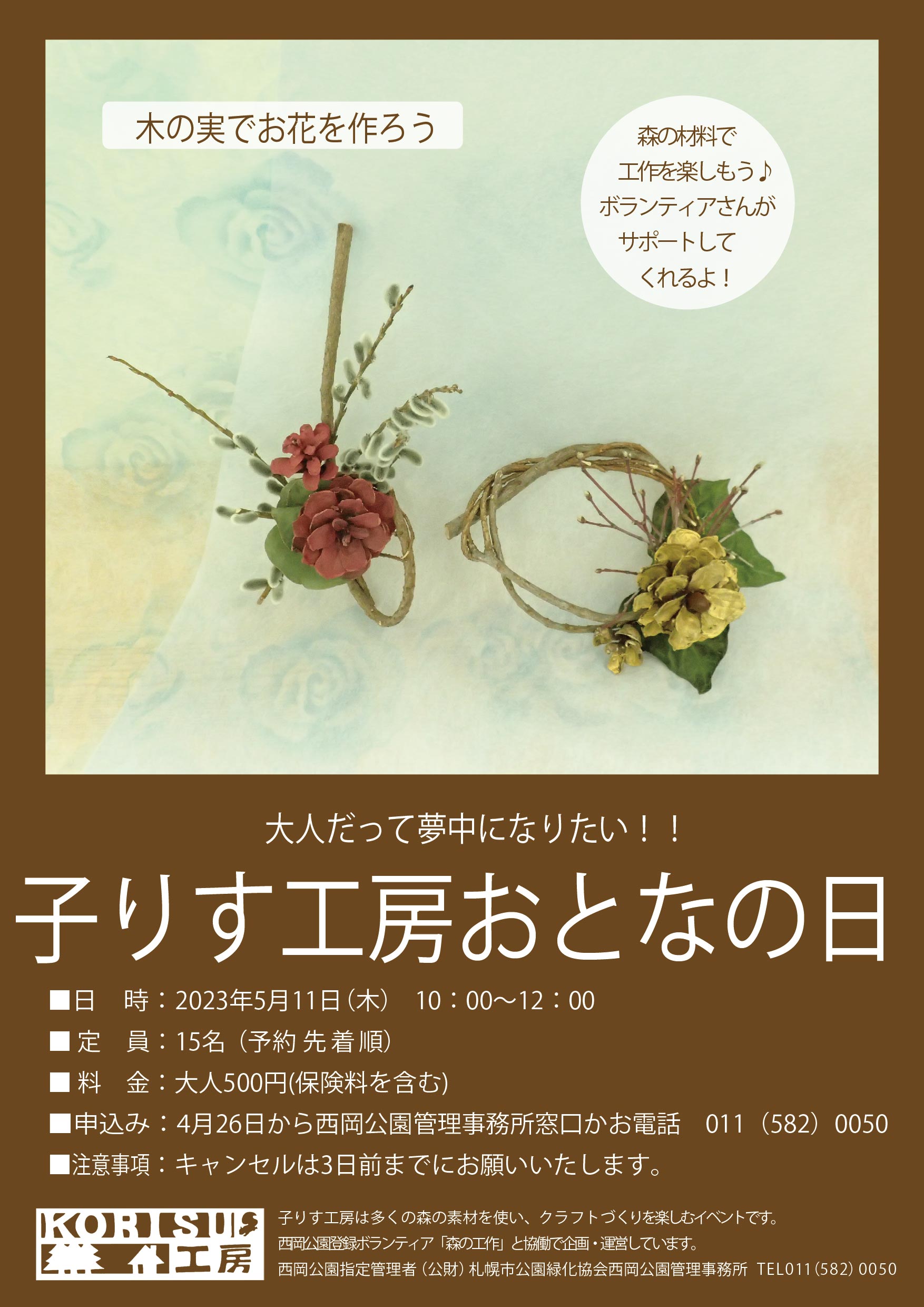 そんな西岡公園では5月11日(木曜日)に「子りす工房おとなの日」開催しますよ。