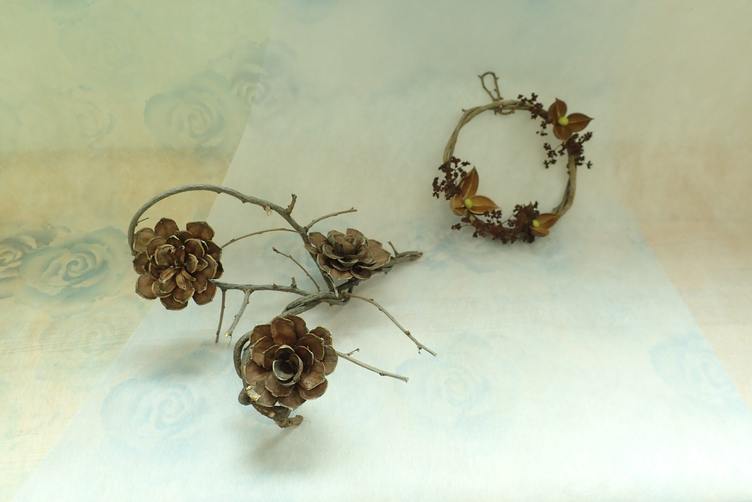 木の実のお花を使ってリースにしたり、オブジェにつけたりアイディア次第でいろんなものにアレンジできます。