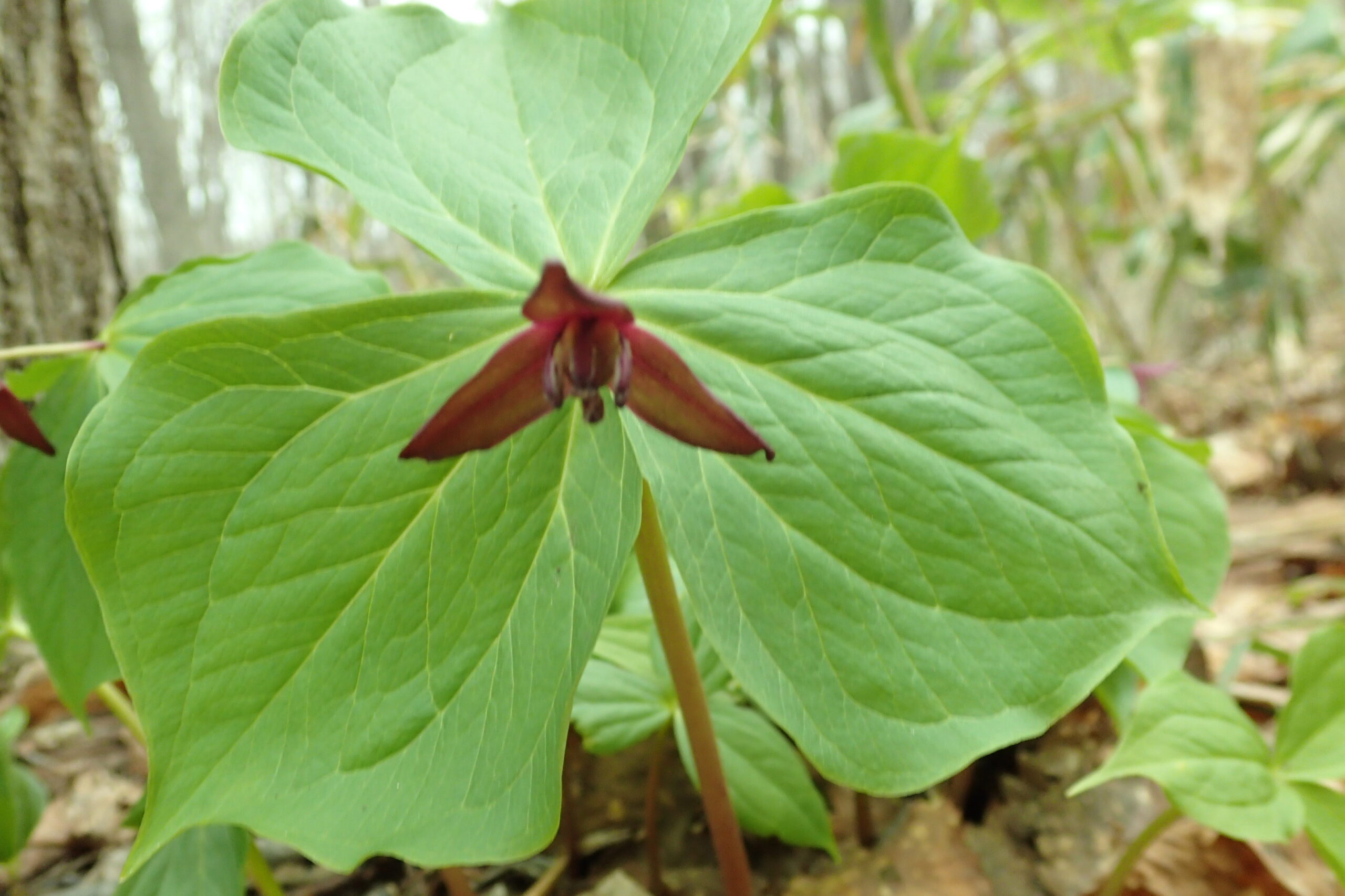 エンレイソウも三枚の鮮やかな緑色の葉を拡げてその上に花を咲かせています。