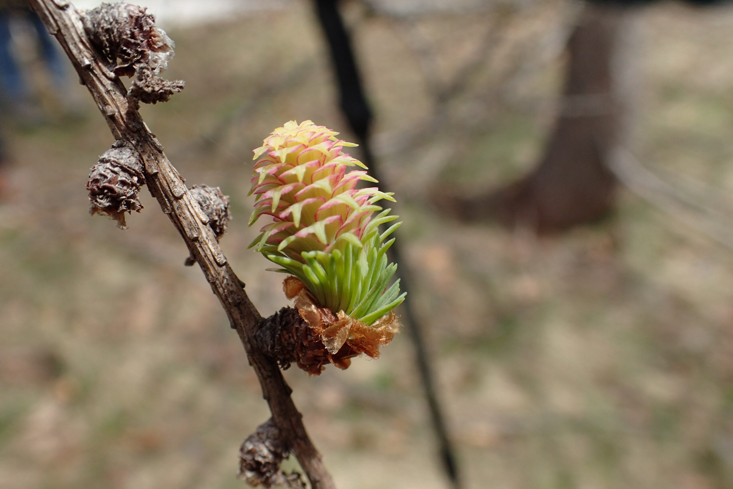 管理事務所を出発して最初に観察したのはカラマツの花です。