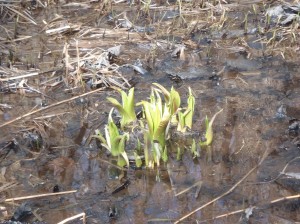 まだまだ芽が出始めのものもありますが、だいぶ白い部分も膨らんでいるもの、 開花しているものも少しあります。 今週末は暖かそうなので、一気に開花しそうですね。 今年のミズバショウは、4月下旬からゴールデンウィークまで楽しめそうです♪
