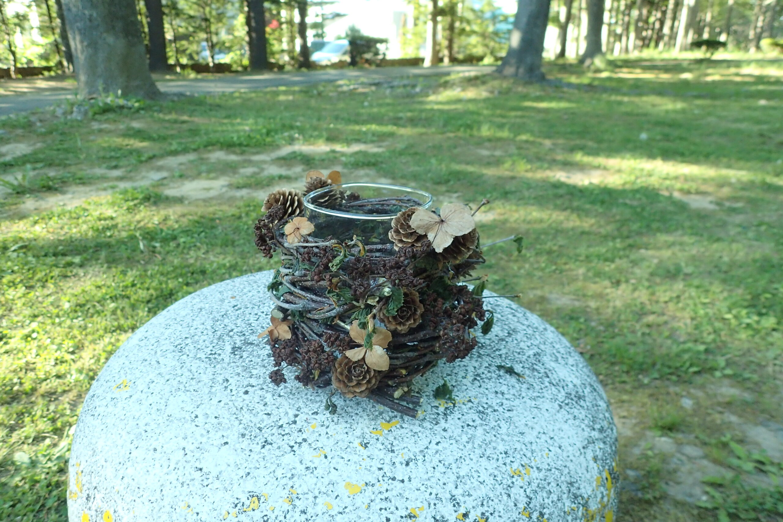 ガラスのコップのまわりに森の材料を飾りつけて小物入れにしたり、