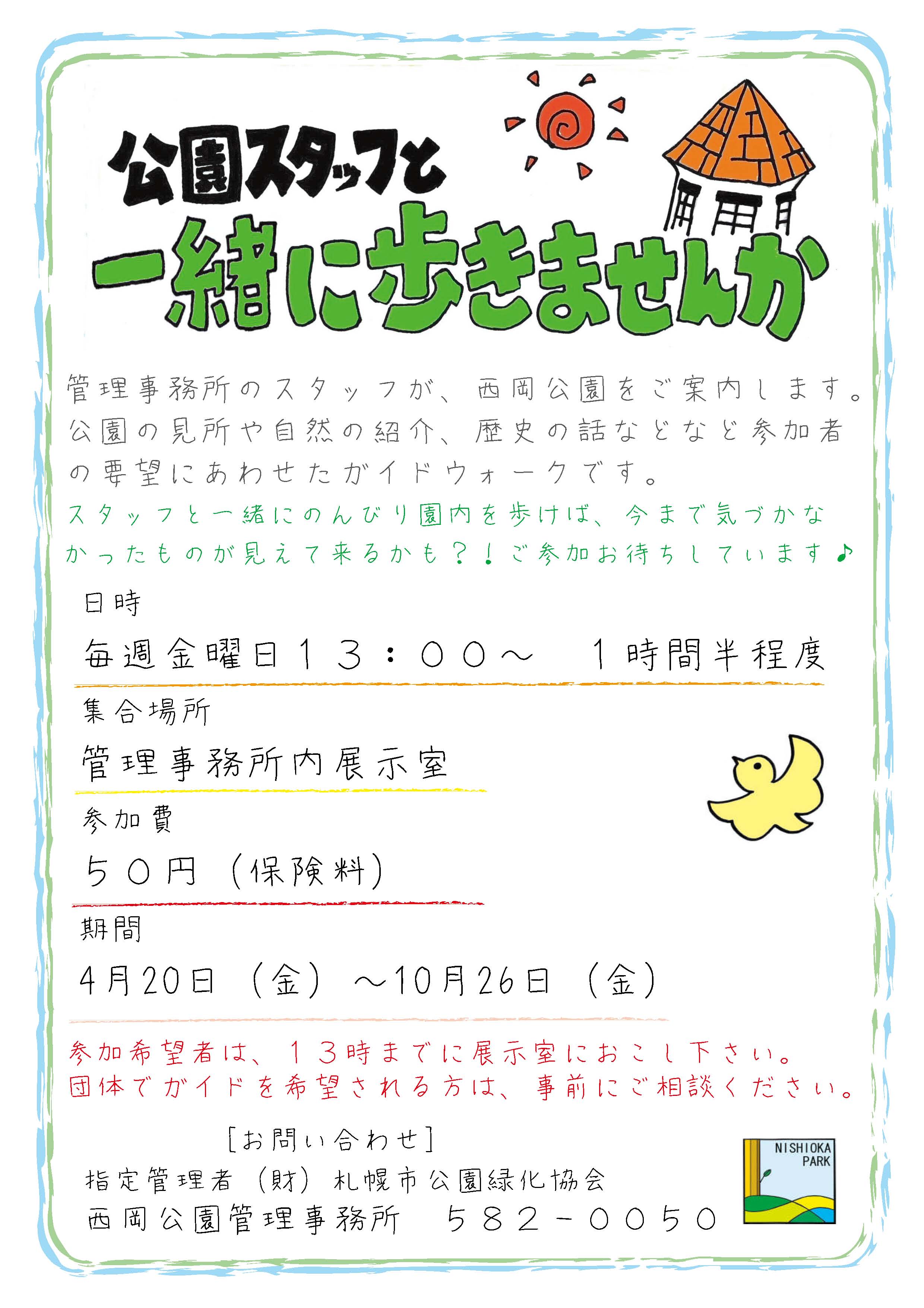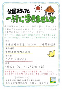 公園スタッフが自然の見所や歴史などを紹介しながら歩くガイドウォークが、 今日からスタートしました! 今日は、まだ少し雪が残る園内を、ミズバショウやフクジュソウなどの植物や、 夏鳥の姿を観察しながら歩く予定です。