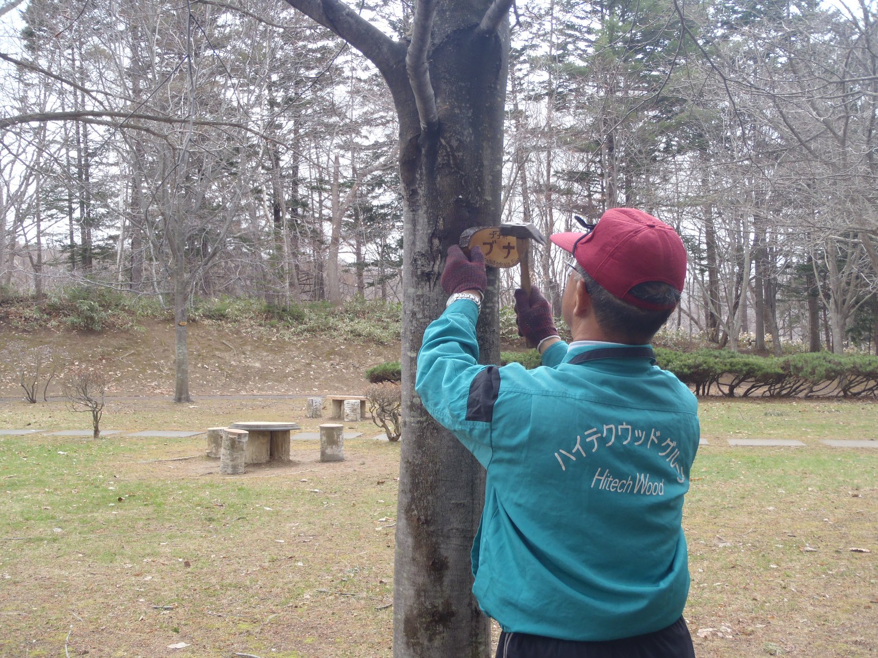 西岡公園は、公園から出た木を使って樹名板を作るボランティア「樹名板工房」 が活動しています。今日は、ゴールデンウィークに向けて、古くなった樹名板を 新しいものに取り替えました。