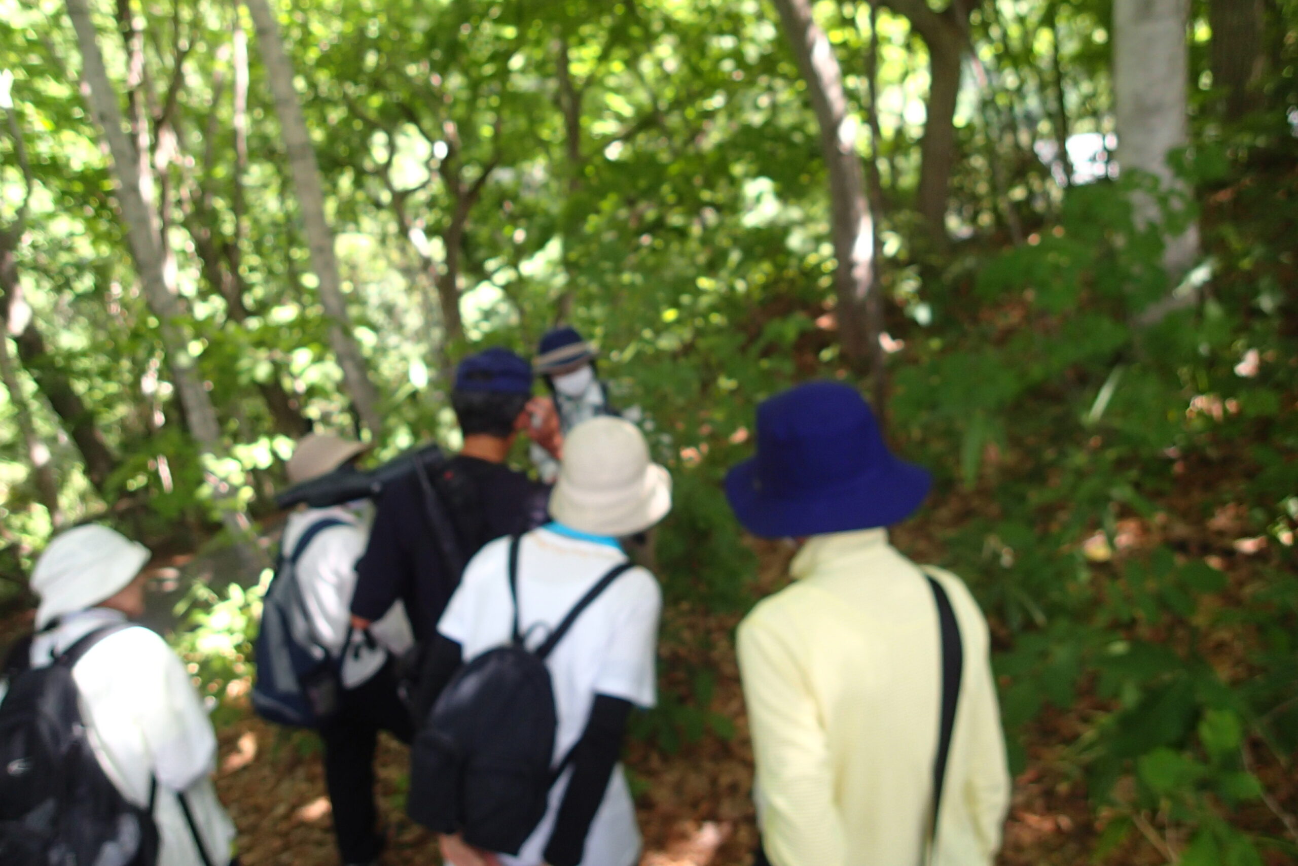 ガイドボランティアさんの話を、聞きながら進んでいきますよ。森の中は涼しいです。