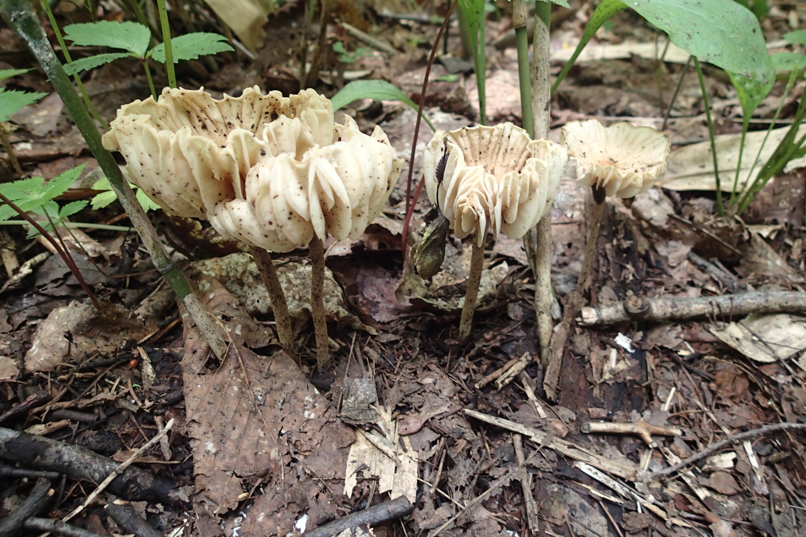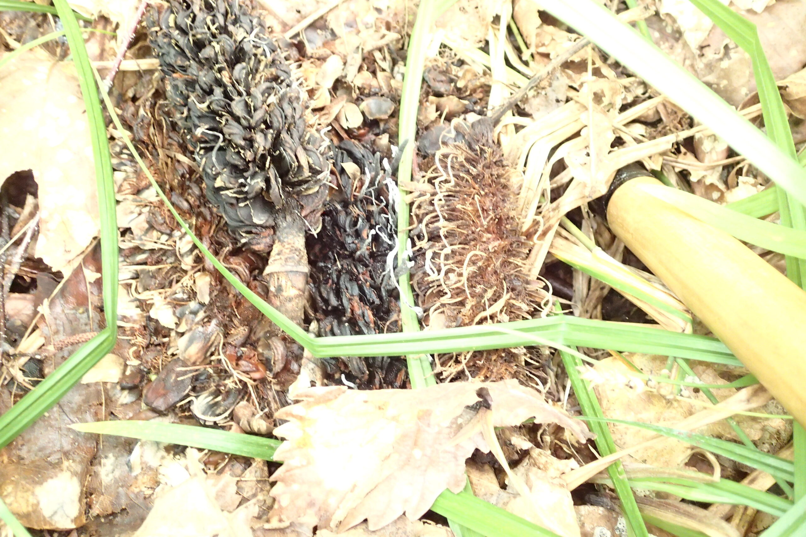 ホオノキの去年落ちた果実からもキノコが出ています。