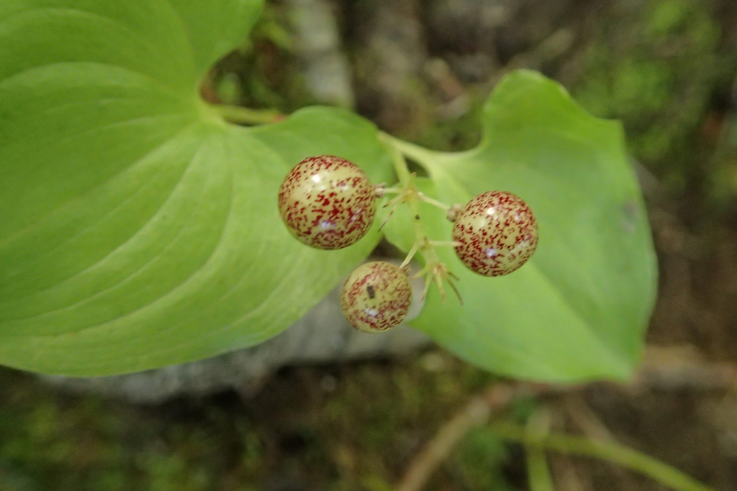 マイヅルソウの果実がウズラの卵のような模様になっていますよ。