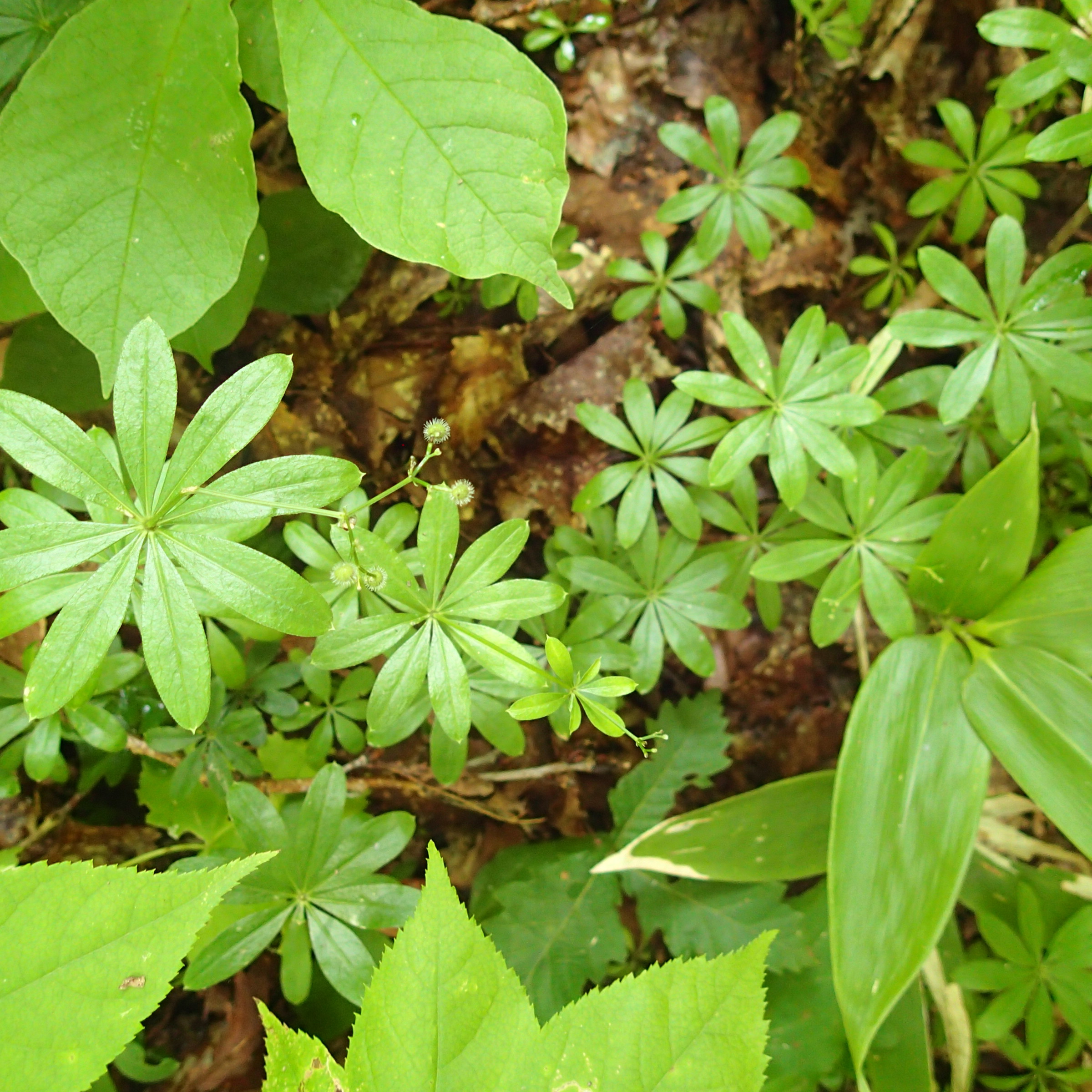 春に白い可憐な花を咲かせていた、クルマバソウの玉のような果実にも細かいフック状の毛が生えていますよ。