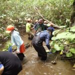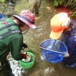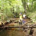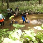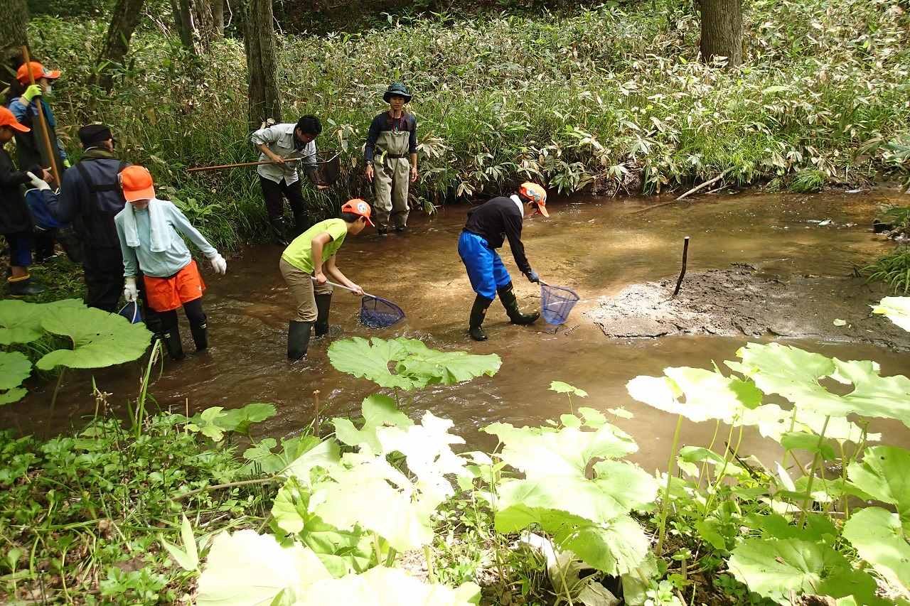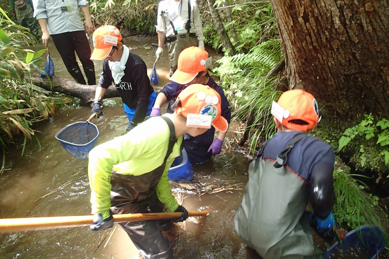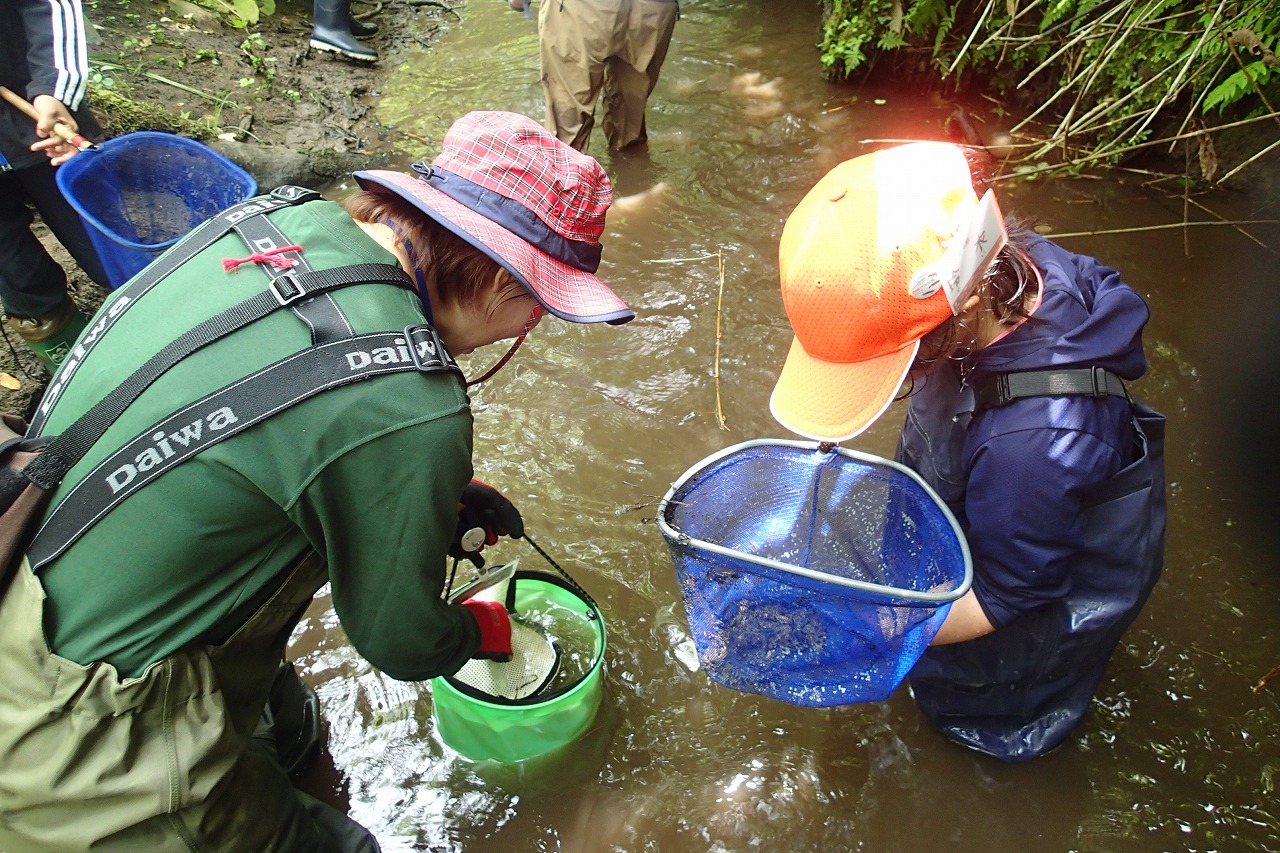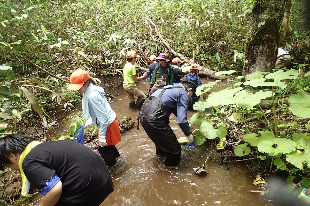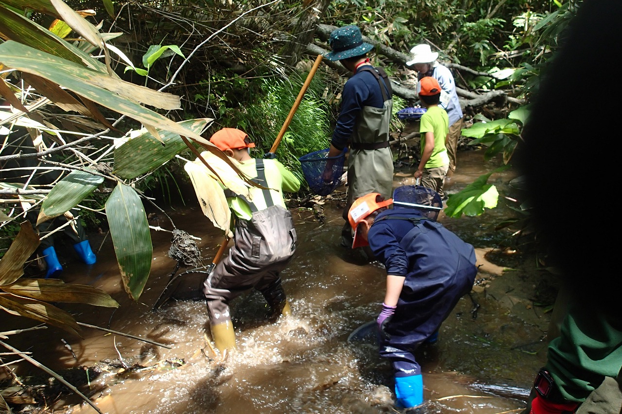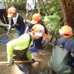 ところどころ深いところもあるので、気を付けながら念入りに調査をしていきます。採取できる個体も大きさが様々で数cm位の小さいものから、15cm超の大きいものまで網にはいります。落ち葉やドロにまぎれた小さい個体もしっかり捕獲していきます。