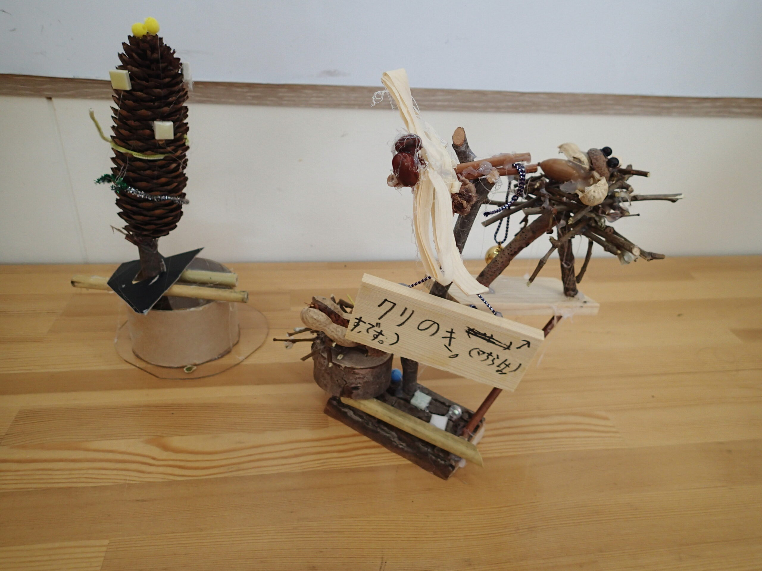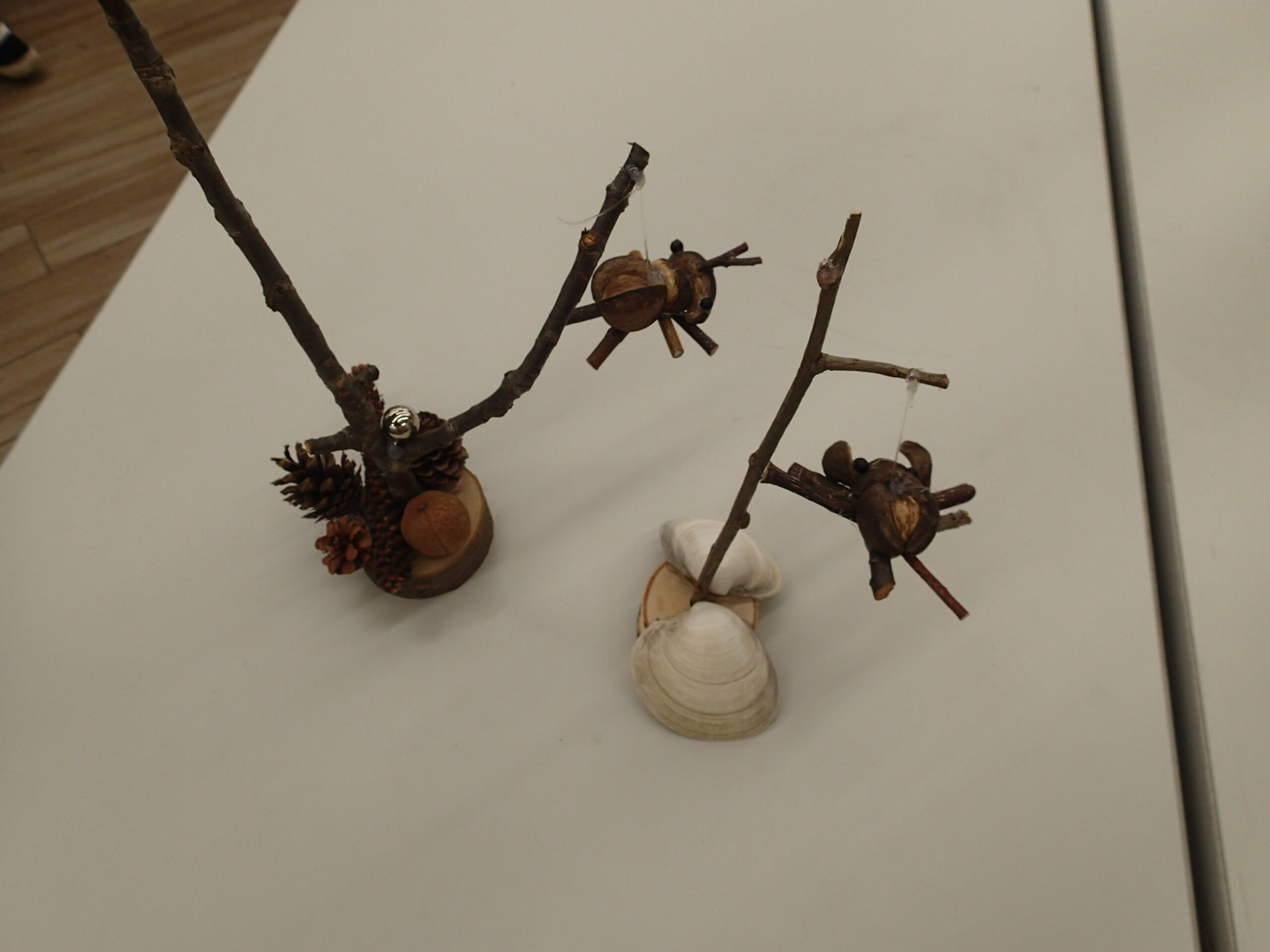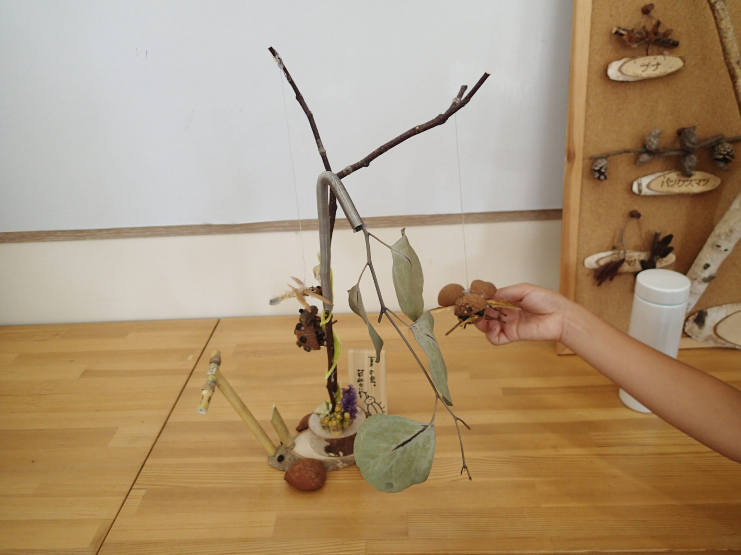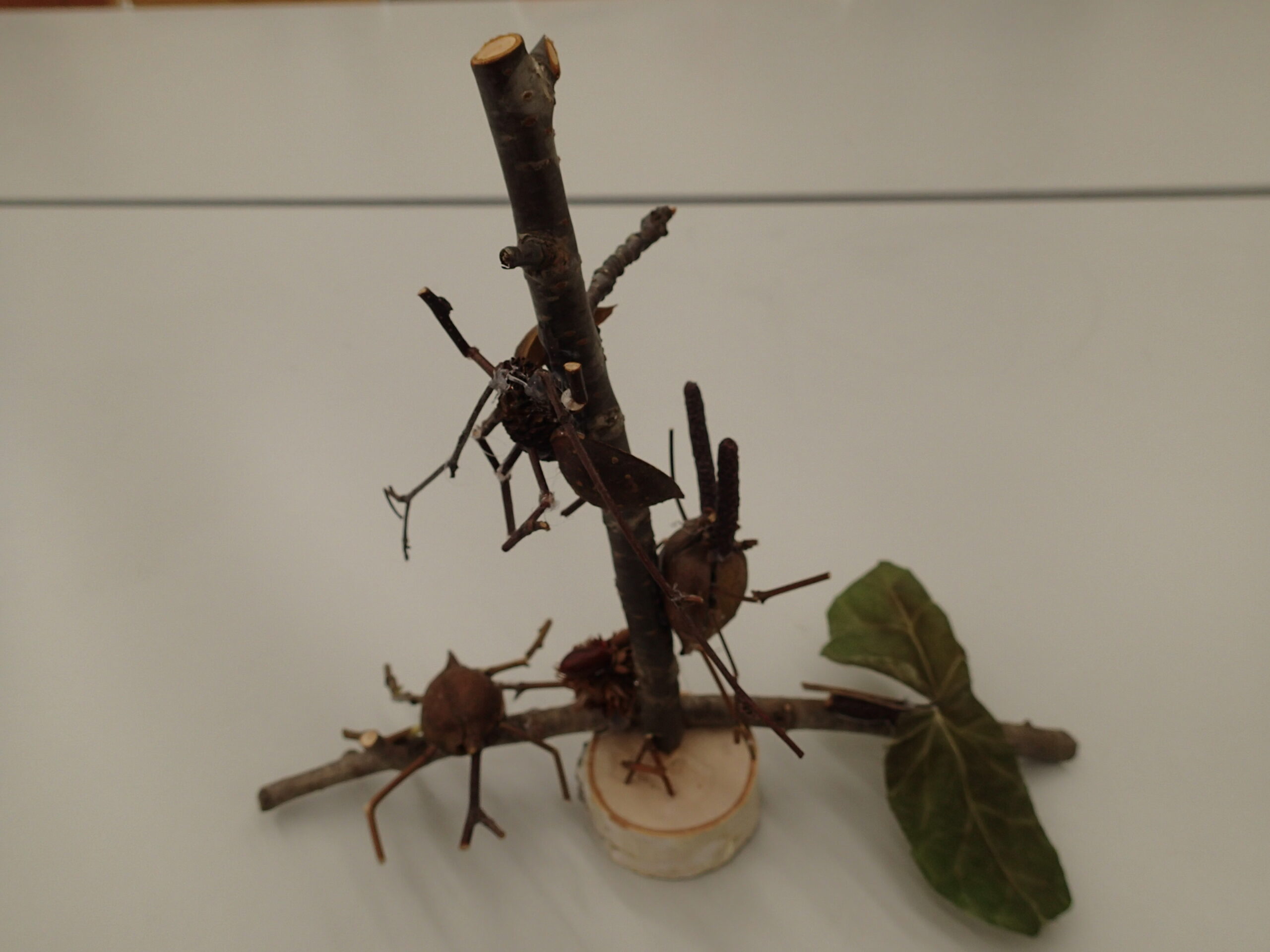野外で出会えるムシたちの様子を、木の実や枝で作ってくれています。
