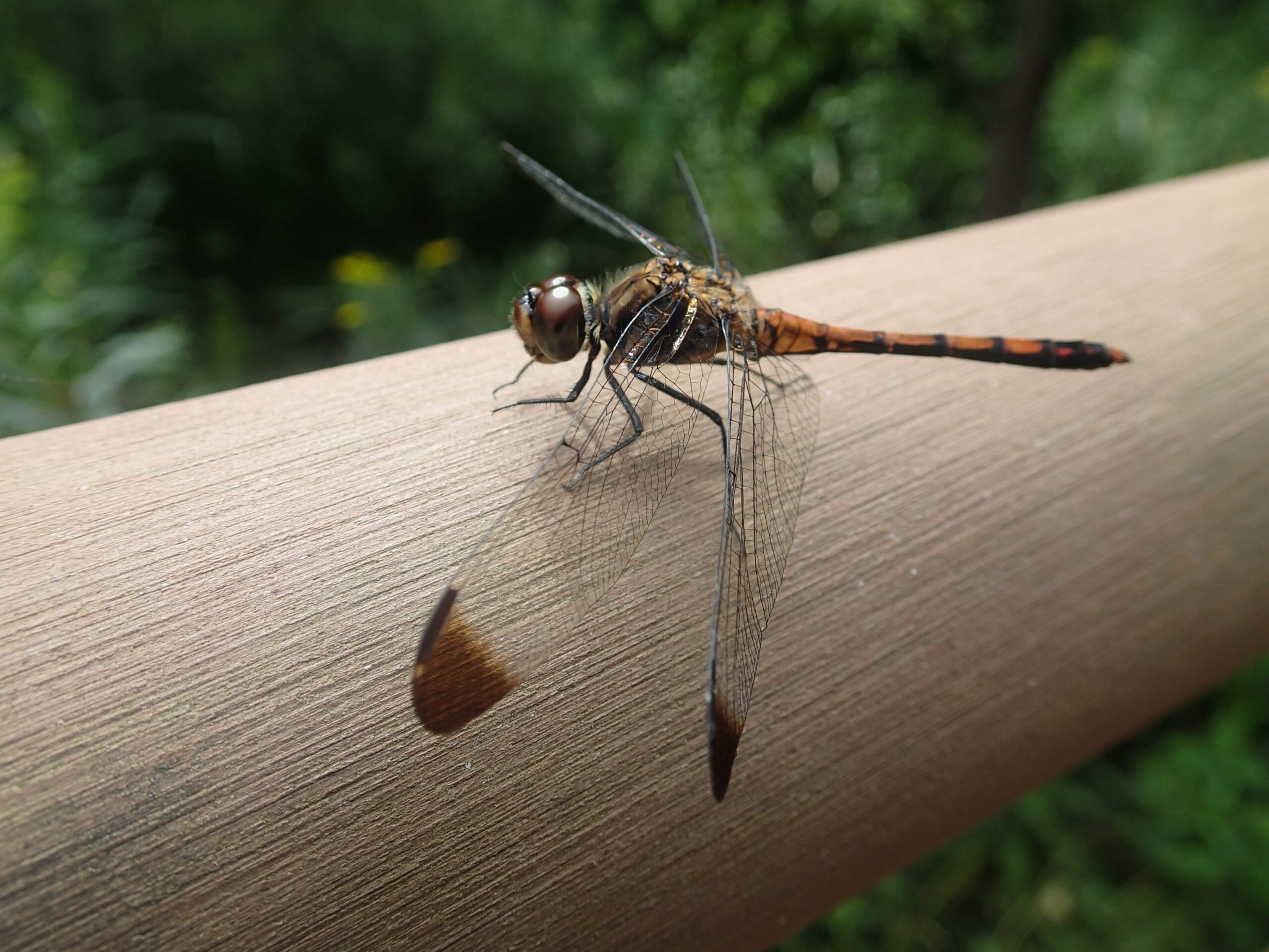 木道の柵には、翅の先がこげ茶色のノシメトンボがたくさんいました。