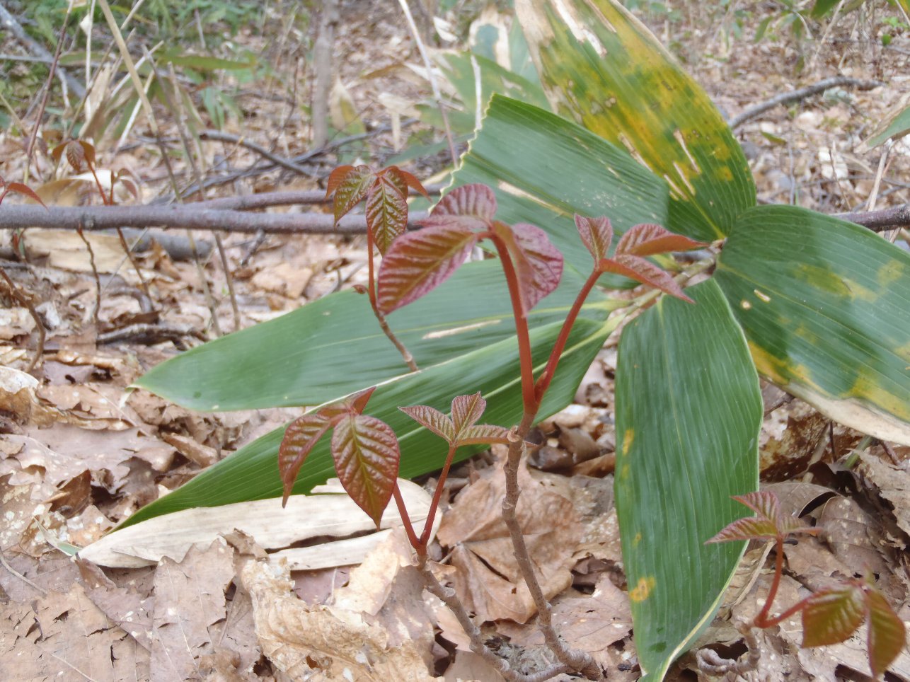 この時期になると園路の脇に、赤茶色の葉っぱがニョキニョキっとでてきます。これはウルシの葉っぱです。肌が弱い人はかぶれるのでなるべく触らないように注意してくださいね。