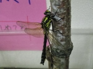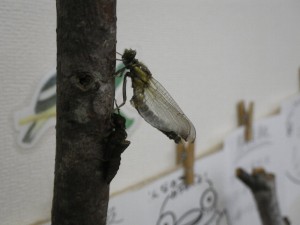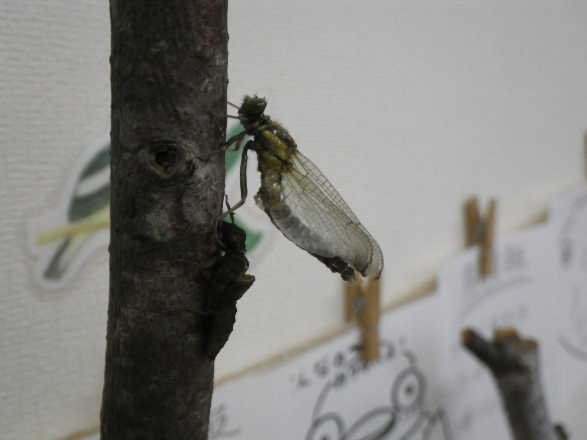 5月6日に展示室へきたトンボのヤゴ、ホンサナエ、モイワサナエ、コオニヤンマの3種類各2匹のうち、ホンサナエが朝に羽化していました。展示室羽化の第一号です。