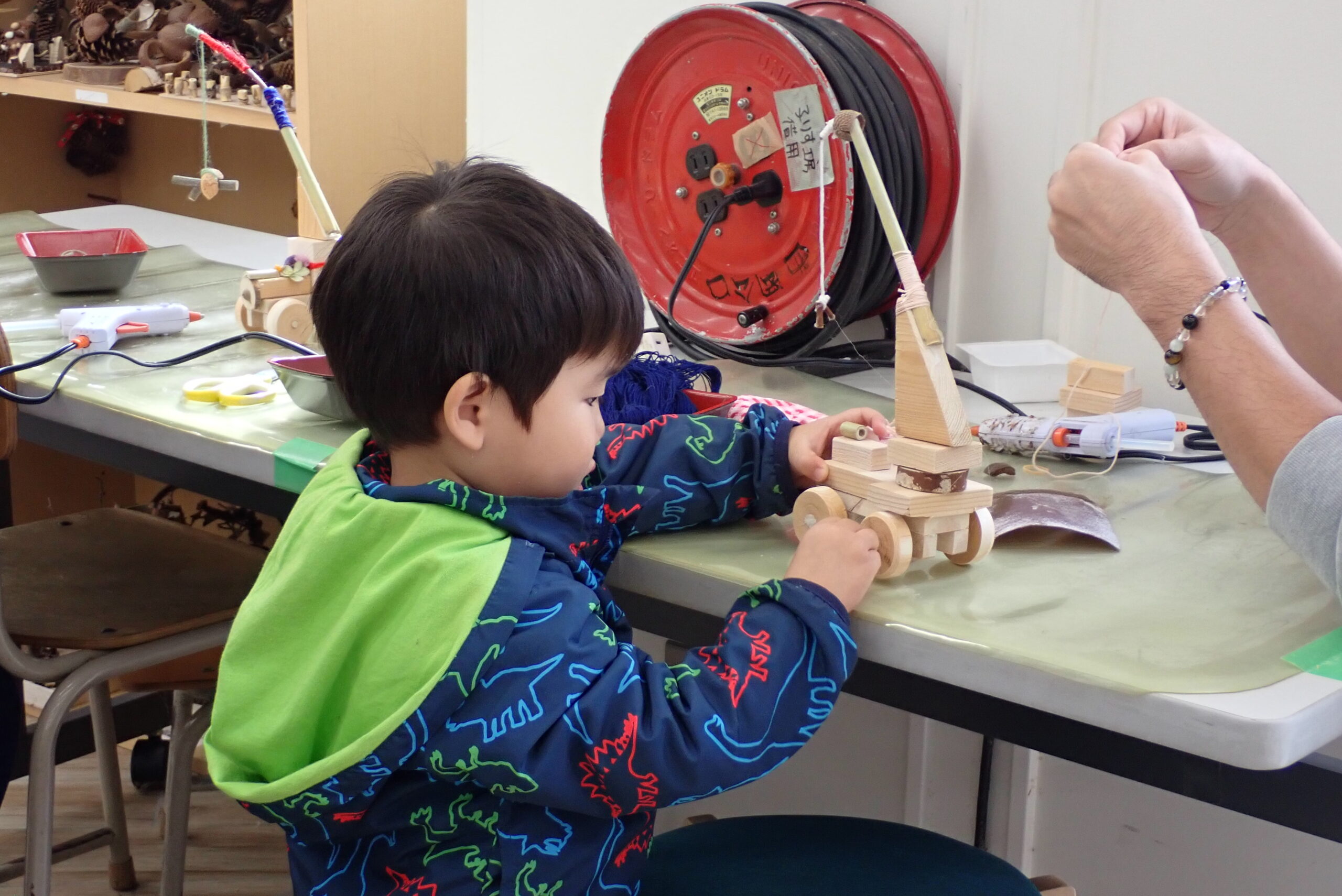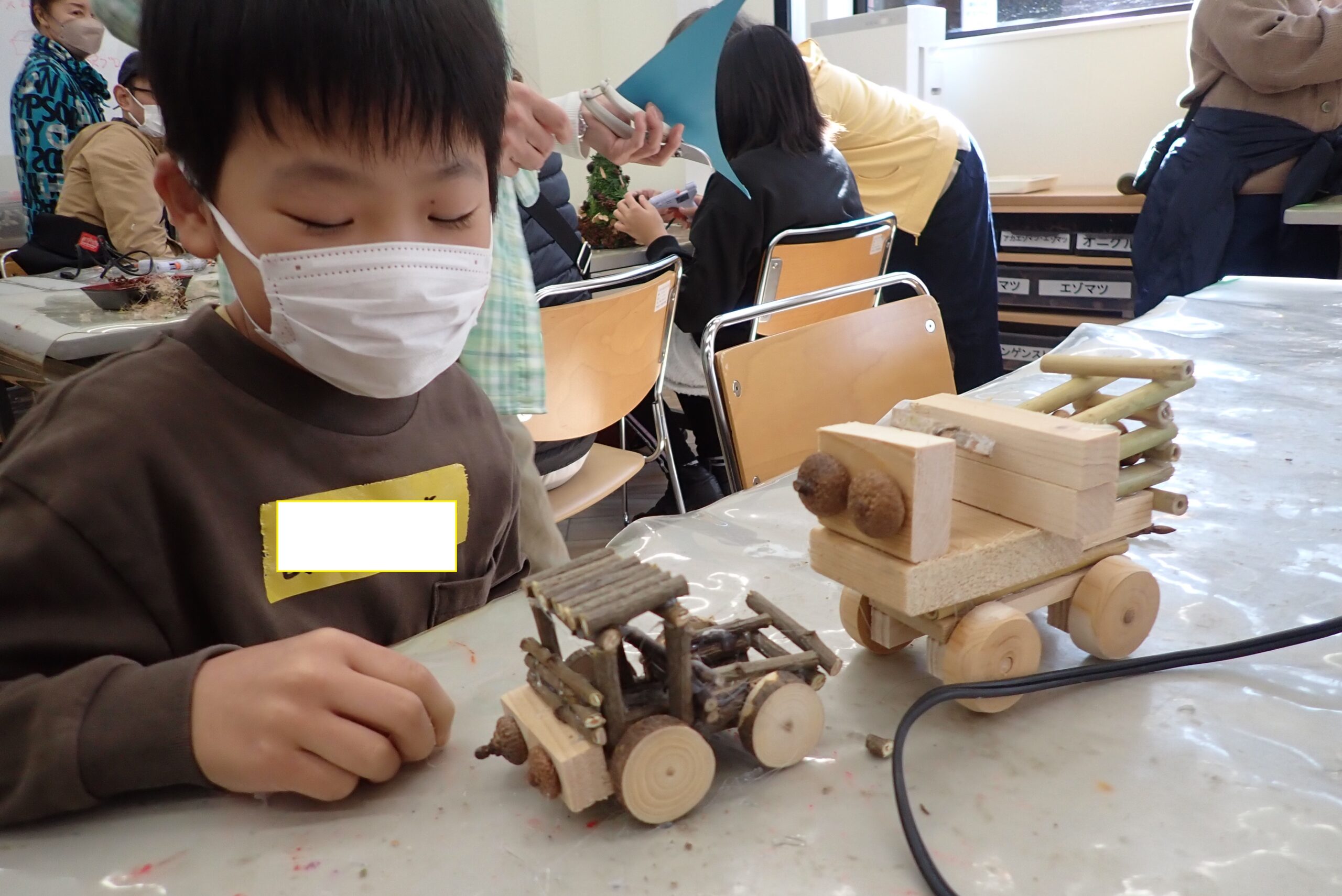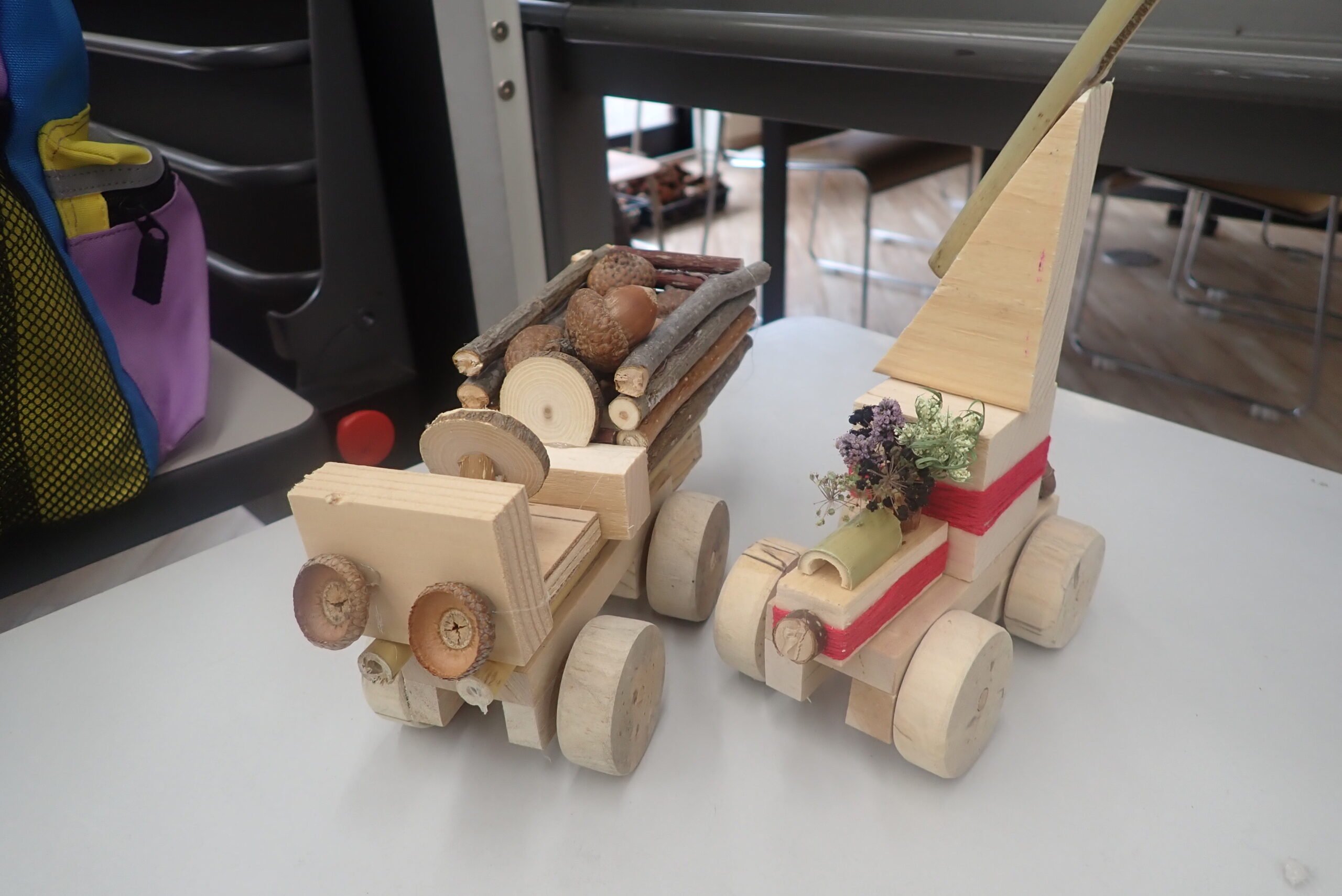 トラックのような荷台のあるくるま、お人形が乗ったくるま、クレーン車、SL機関車を作ってくれた子もいました。