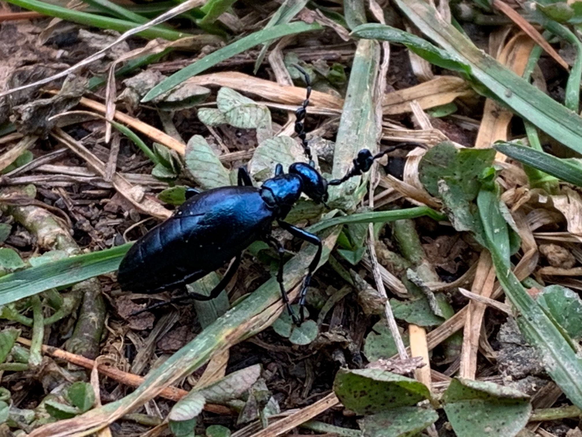 草地には、メタリックブルーの昆虫、メノコツチハンミョウの姿がありました。