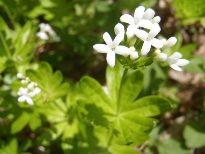 この時期は、白くて可憐な花がいろいろ咲き始めます。 写真は「クルマバソウ」です。群生して咲いていて、とてもかわいいです。 実は、乾燥するとわたあめのような良い匂いがする植物なんですよ。