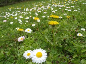 自由広場は少しだけ草が伸び、白や薄ピンク、黄色の花が咲いていてとてもきれいです。黄色い花は、もちろんタンポポ。では、白と薄ピンクの花は? 数年前まで公園内では見られなかった帰化植物「ヒナギク(デージー)」です。