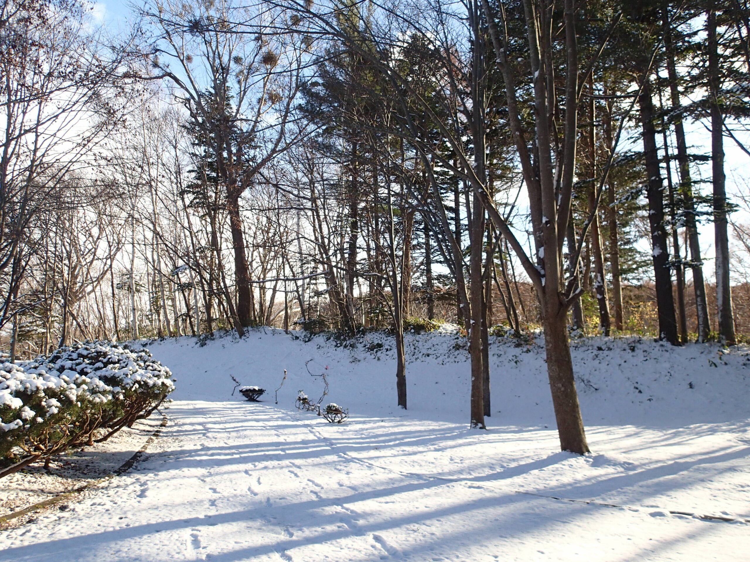 雪が降りましたね。西岡公園では3cmはどの積雪でしたが、園内は気温が低く午後になっても雪が残っています。
