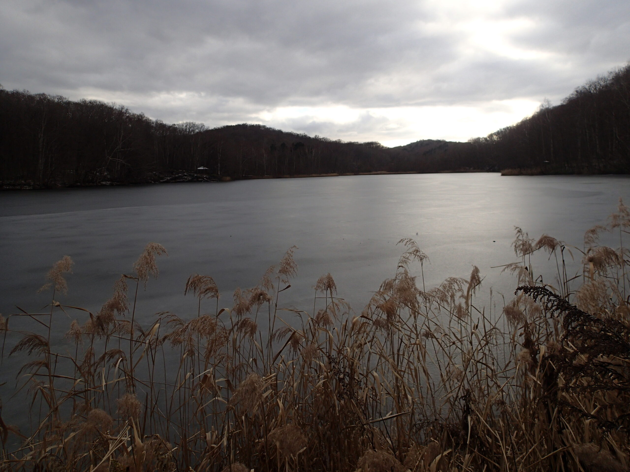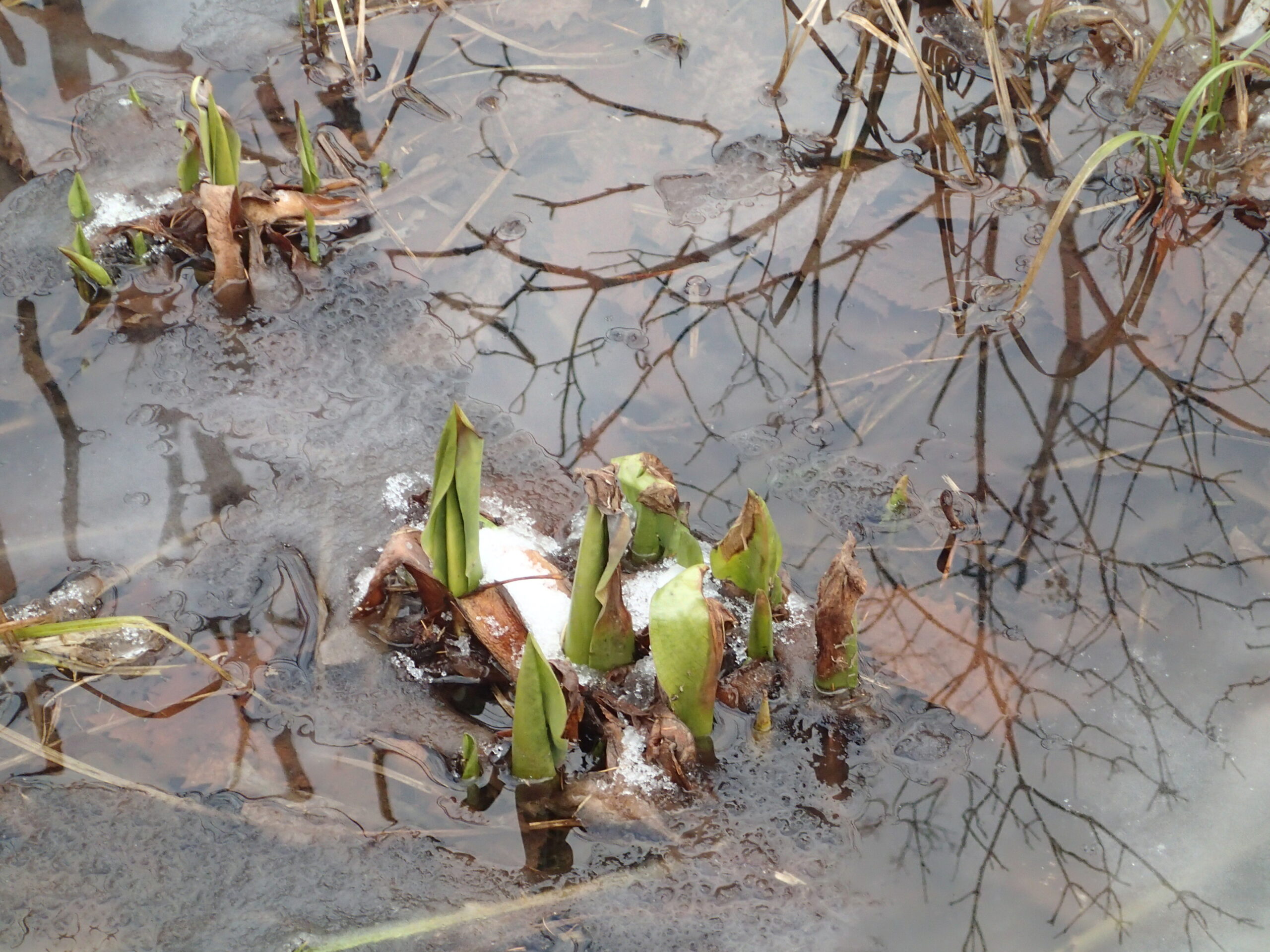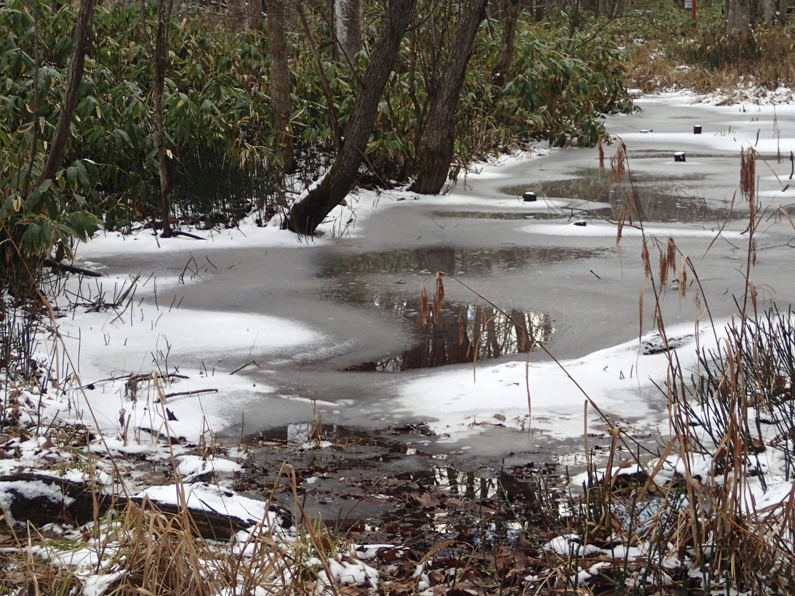 今日は気温がプラスになり池の氷の上に積もっていた雪が融けていました。
