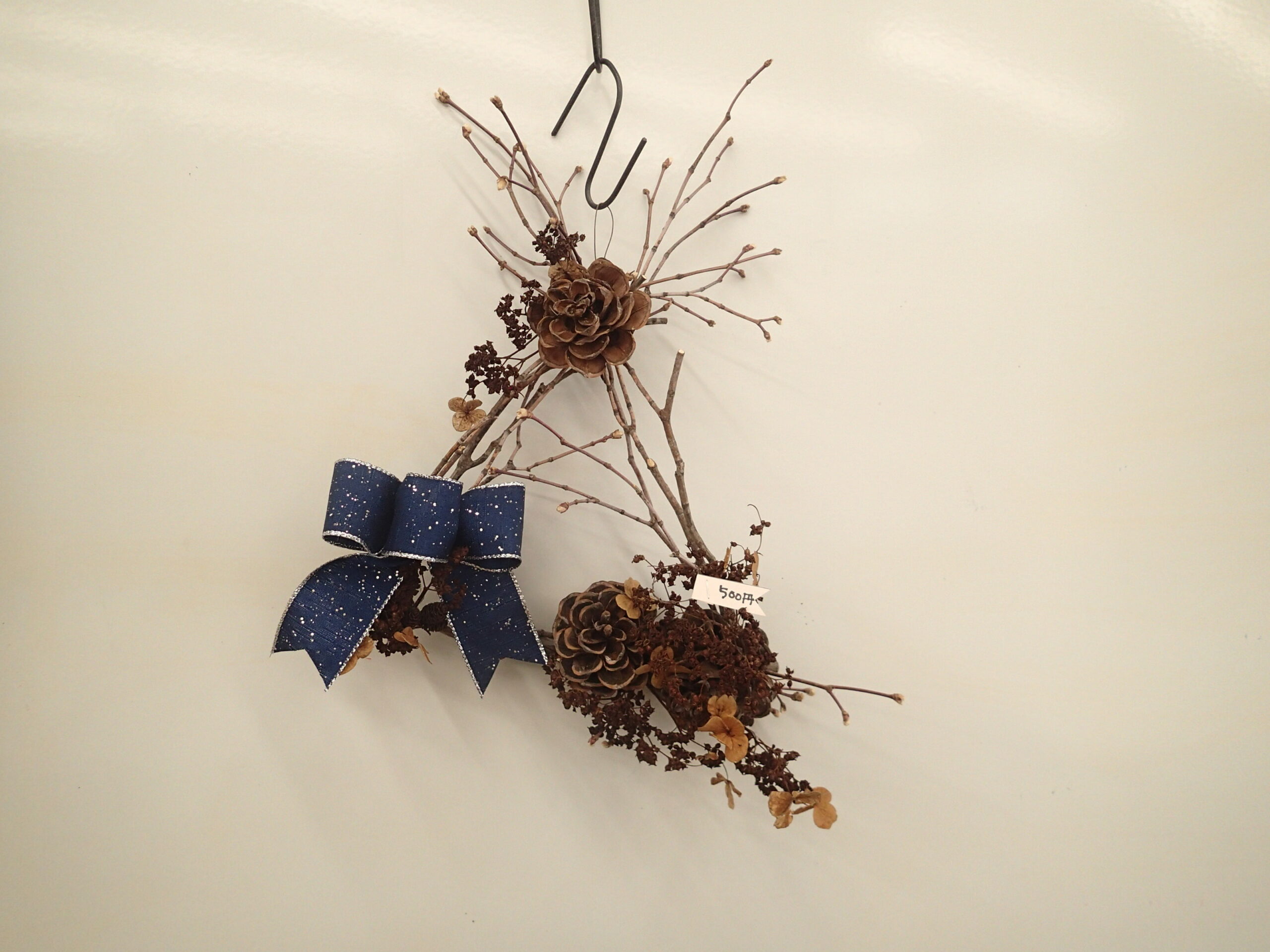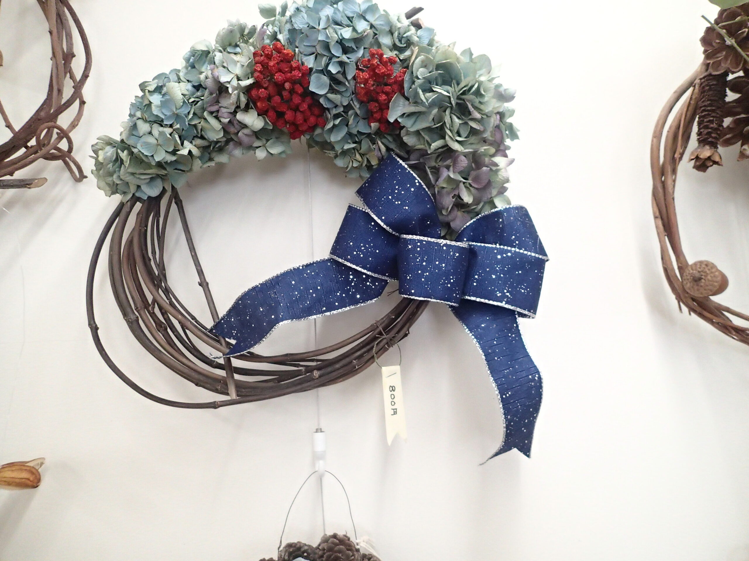 ブルーのリボンがクリスマスらしい、ドライフラワーを使ったリース