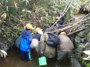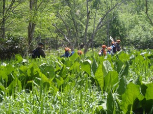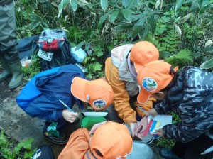 ジャングル川は、去年も一昨年も調査している場所ですが、道なき道を突き進むので、なかなか目的地にたどり着くのは大変です。ミズバショウの大きな葉っぱや、背丈以上に伸びたササに阻まれながらも一生懸命歩きました。でも今日は、ずいぶん歩いているなぁ・・・・と思っていたら、なんとジャングル川を通り過ぎていました!!隊員たちもみんなビックリ!「隊長しっかりしてよぉ~」なんて声もちらほら・・・・。