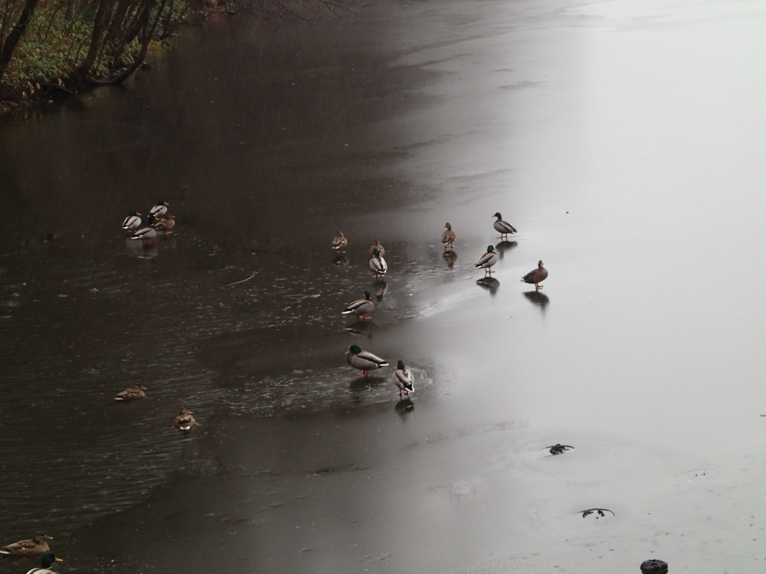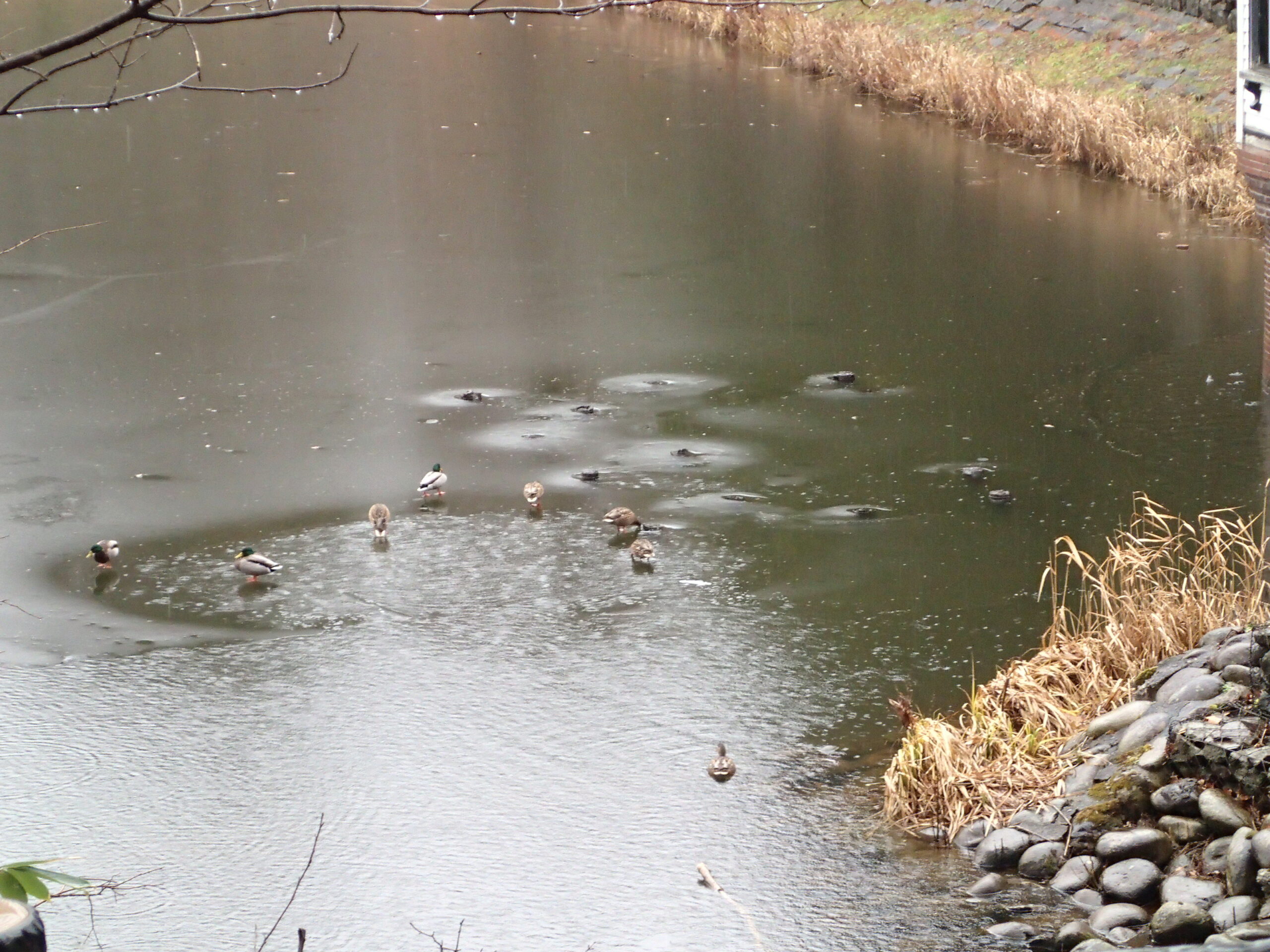 マガモたちは、池の一部が少し融けて、プールのようになったところにも集まっていましたよ。