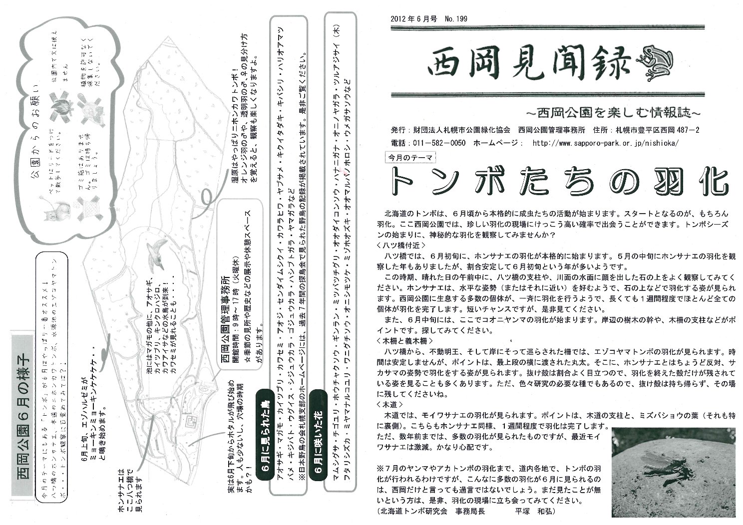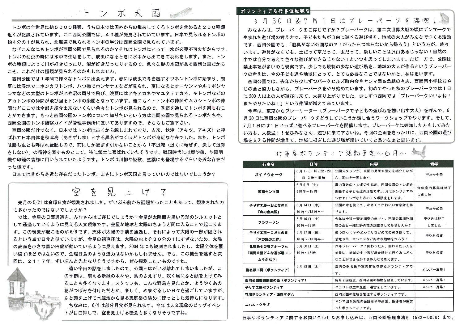 6月の見聞録はトンボたちの羽化についてです。今回は初めての試みで、1P目を西岡ヤンマ団の指導に来てくれているトンボのおじさんが書いてくれました。記事では6月のトンボの種類と羽化をしている場所について詳しく書いてくれているので、どこでどのトンボのヤゴが羽化をしているのかがわかる記事となっています。西岡見聞録は管理事務所で配布していますので、お立ち寄りの際はお手に取ってご確認ください。