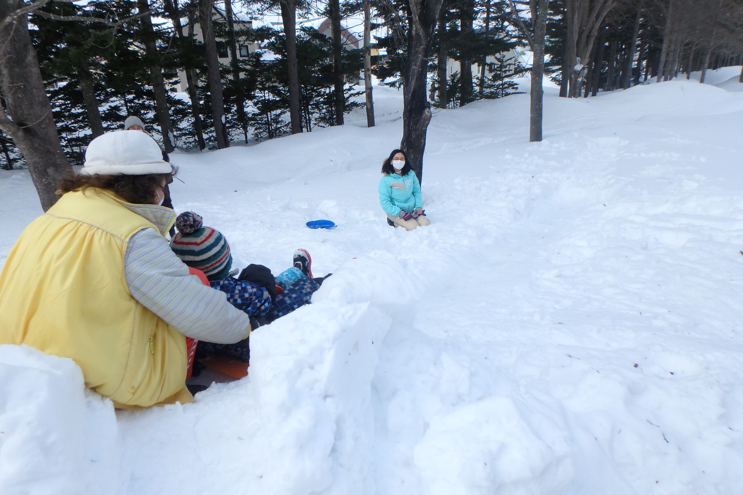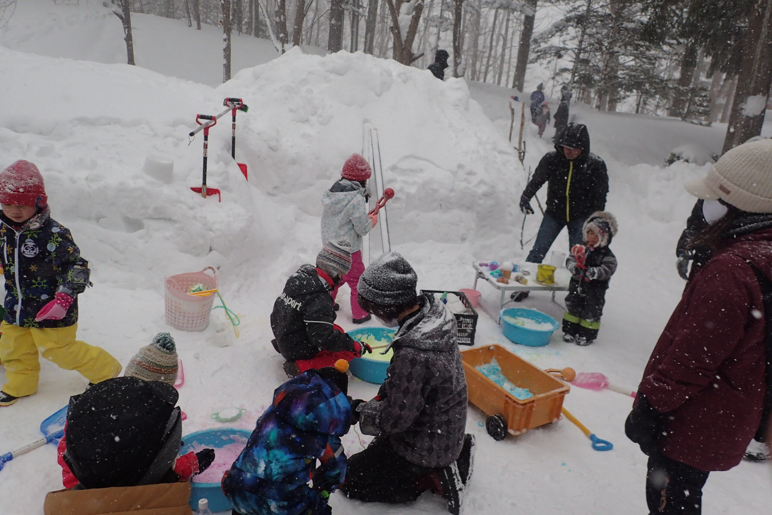 3時ころからスタッフと作りたい希望者で、バケツに雪を詰めてひっくり返して...どんどん作っていきますよ。
