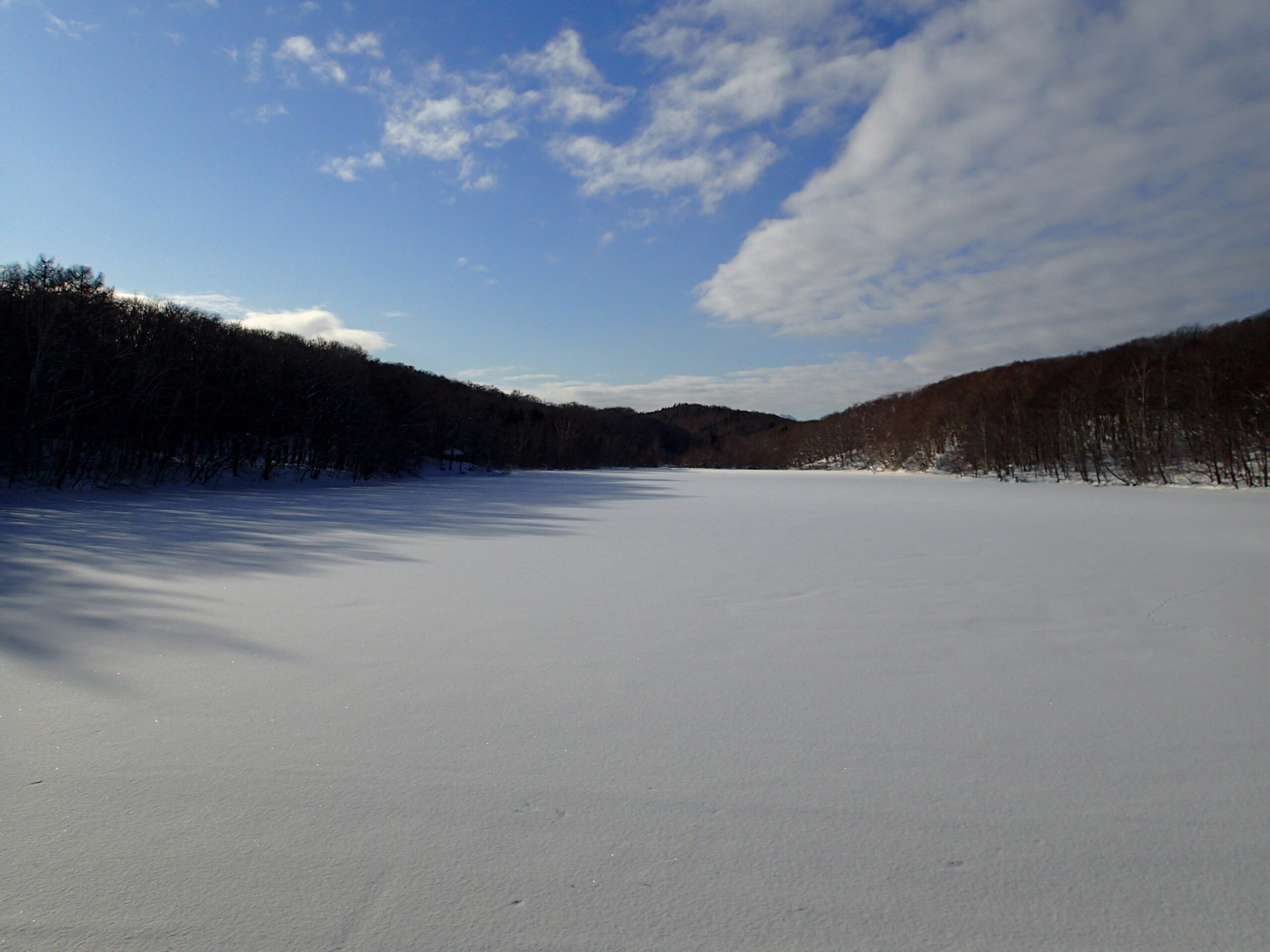 池が広々とした雪原のように見えます。