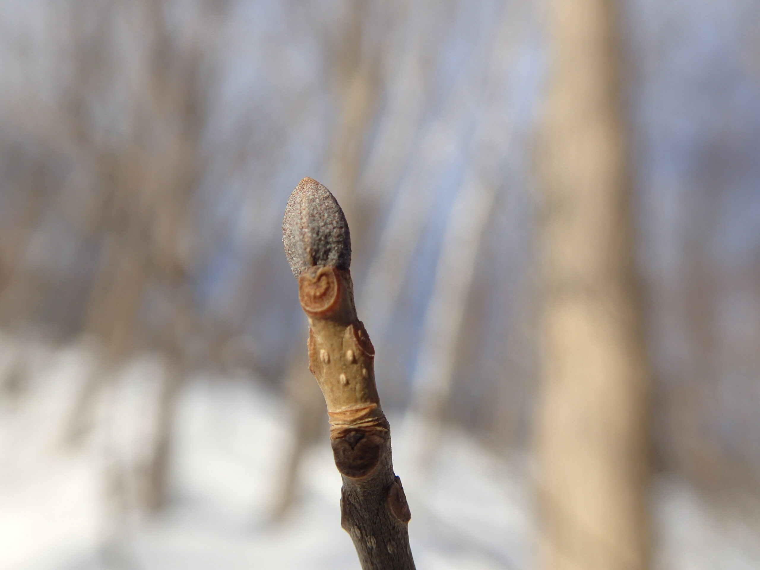 コーヒー豆のような形をしているのはアオダモの冬芽。