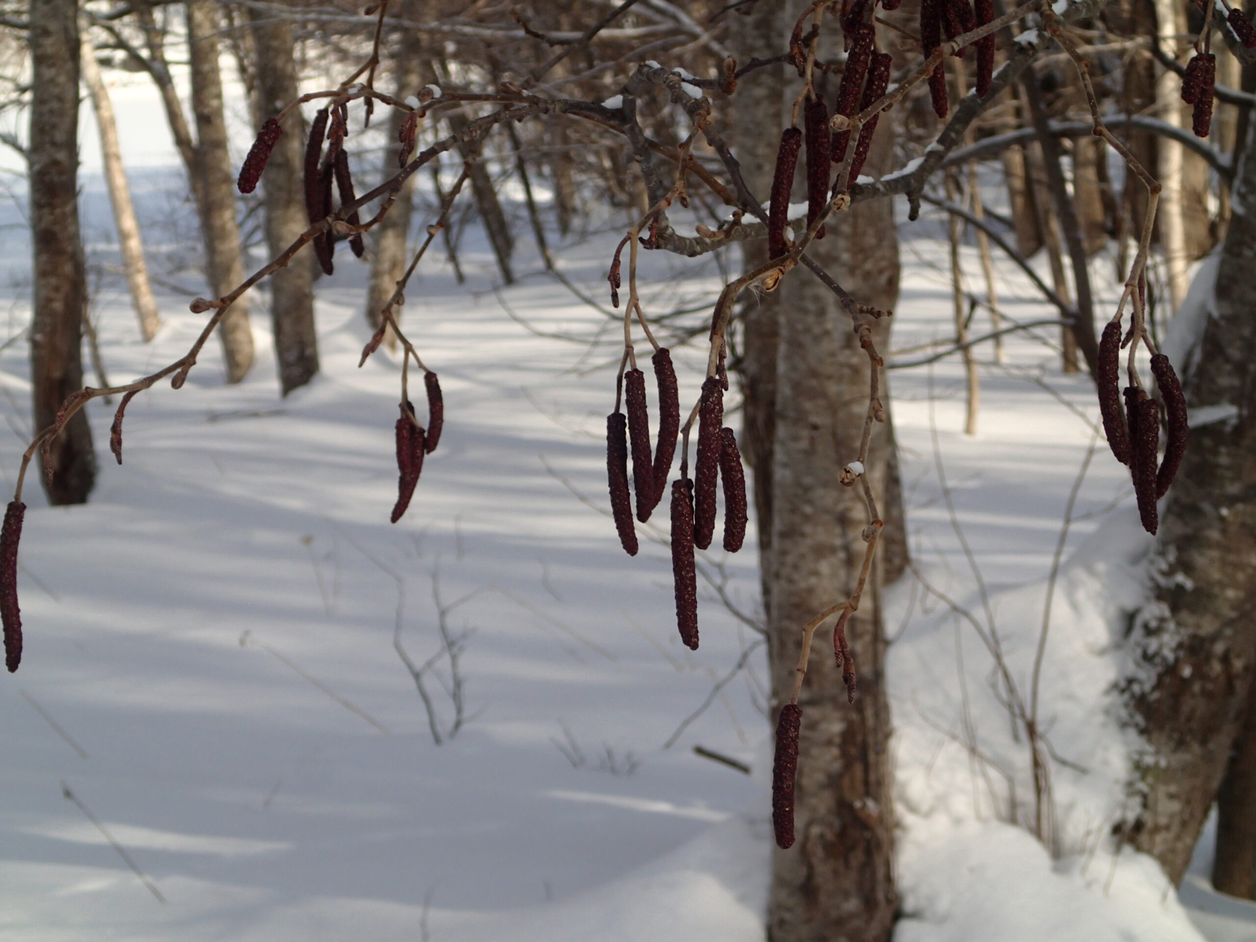ケヤマハンノキの枝先から雄花序がぶら下がっていました。