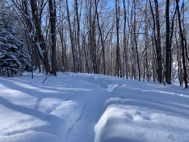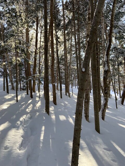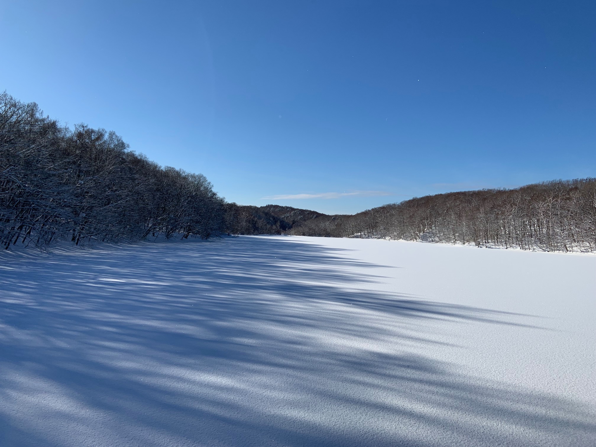 凍った池の雪の上には周りの樹木の影が長く伸びています。