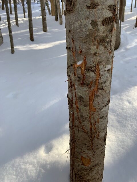 森の中には、樹皮が縦に削られた跡が何本もついている樹がありましたよ。