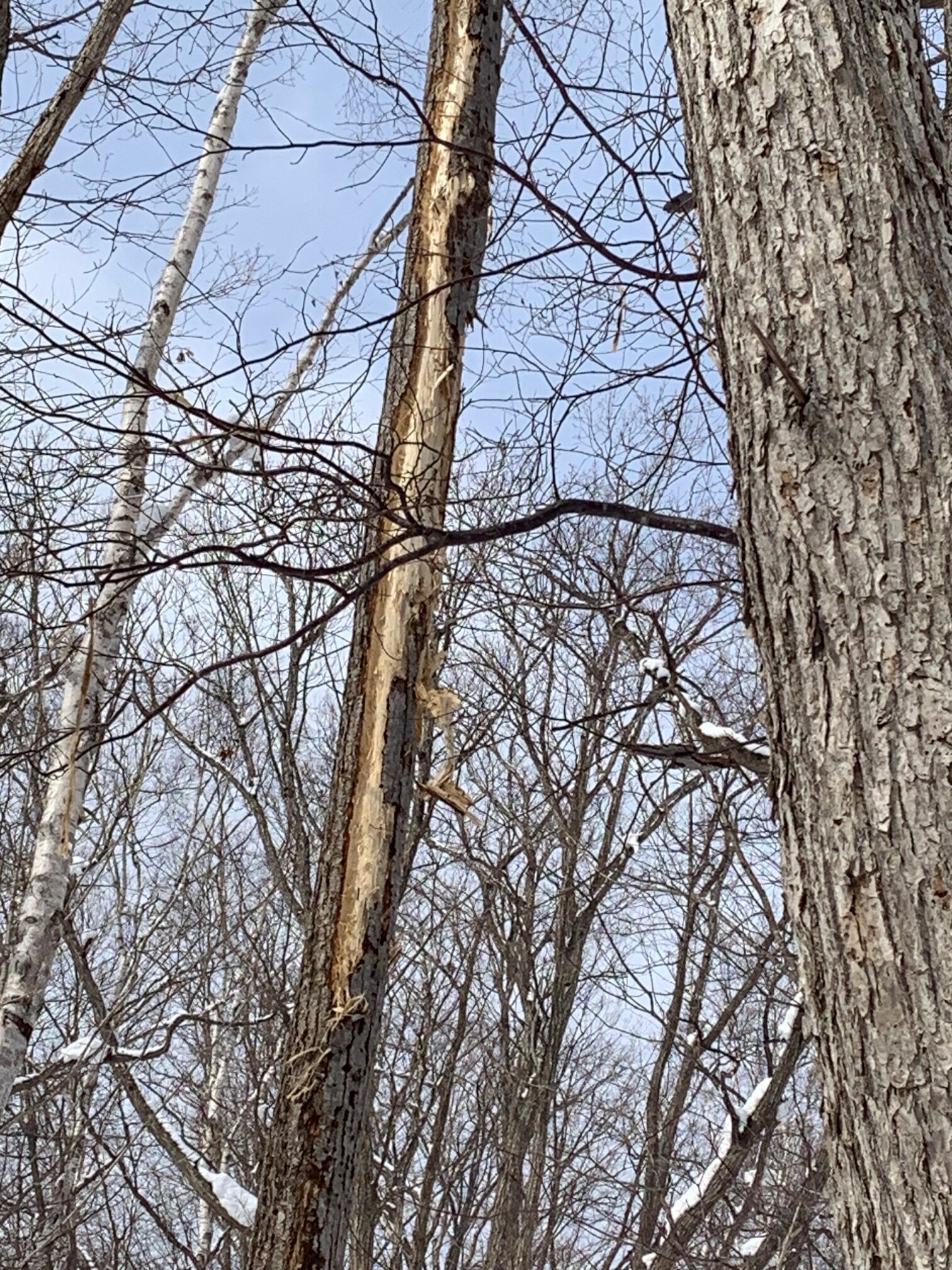 視線を上の方向にたどれば、樹皮がはがれた枯れ木がありました。