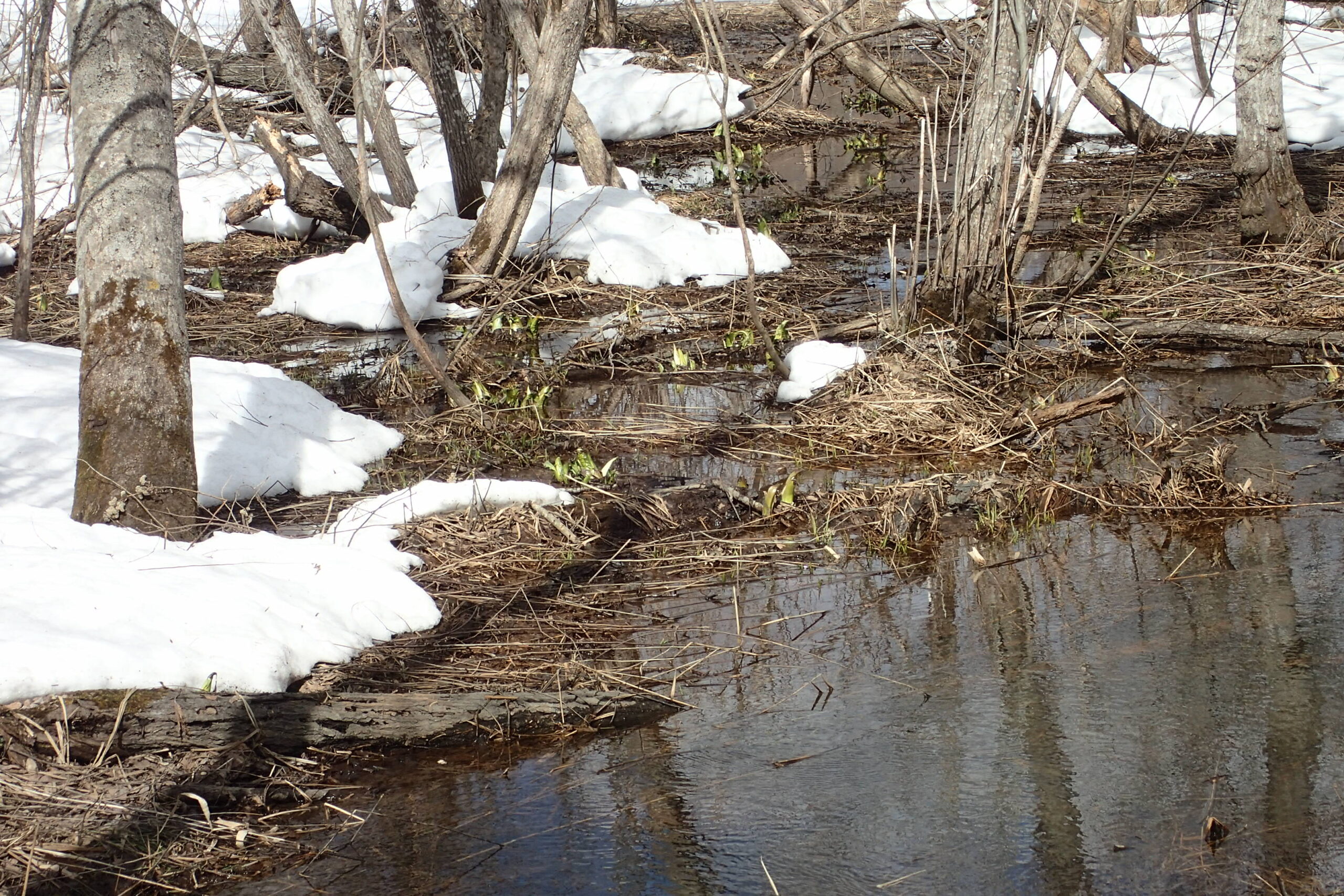 湿原にも雪がまだ残っていますが、ミズバショウの芽が出ていました。