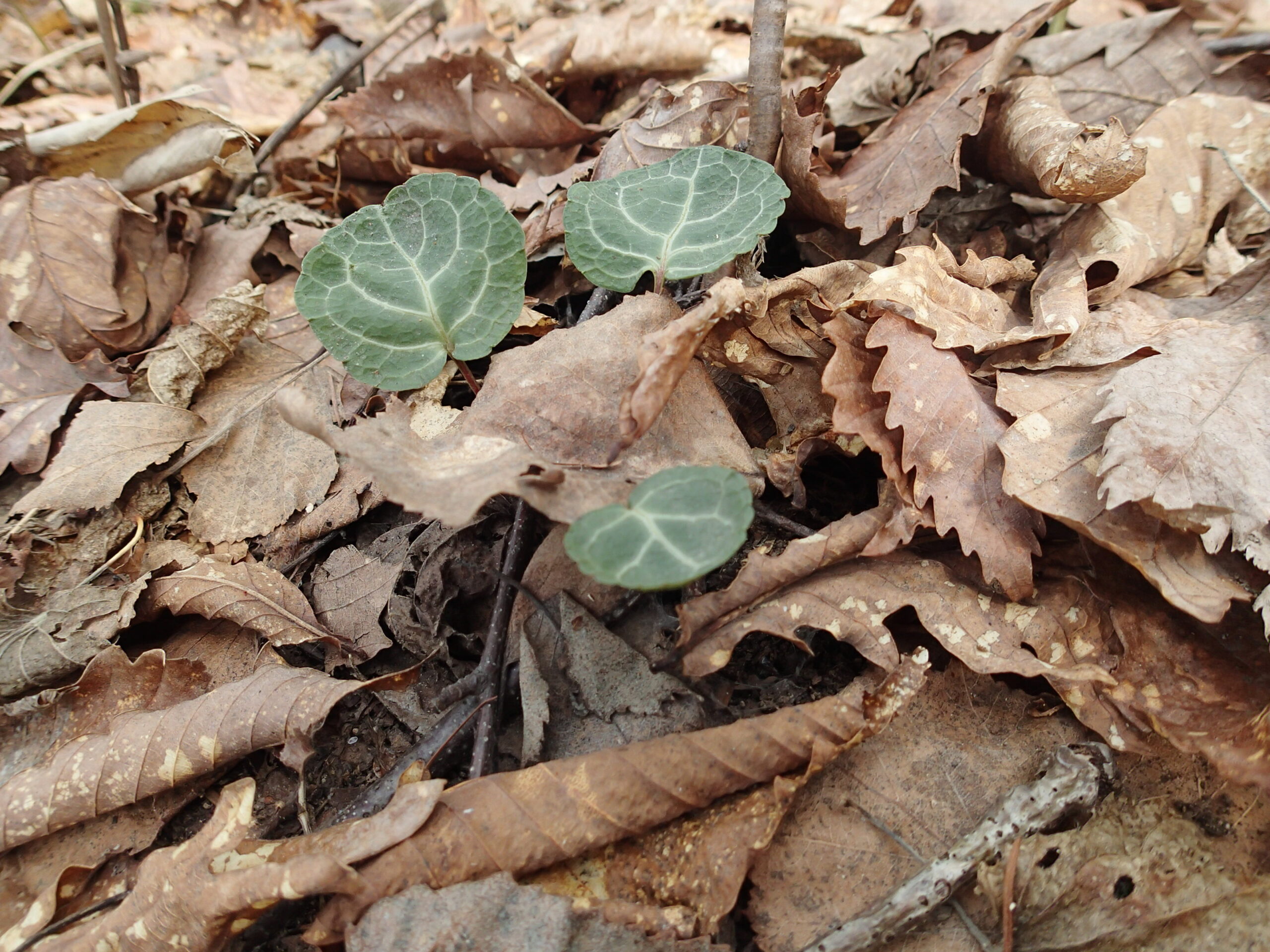 ジンヨウイチヤクソウの葉が落ち葉の間から顔を出していましたよ。