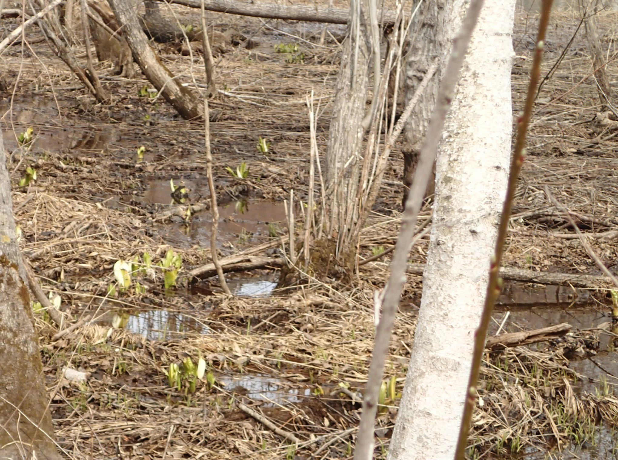 ミズバショウも仏炎苞の白い色が見え始めていますよ。