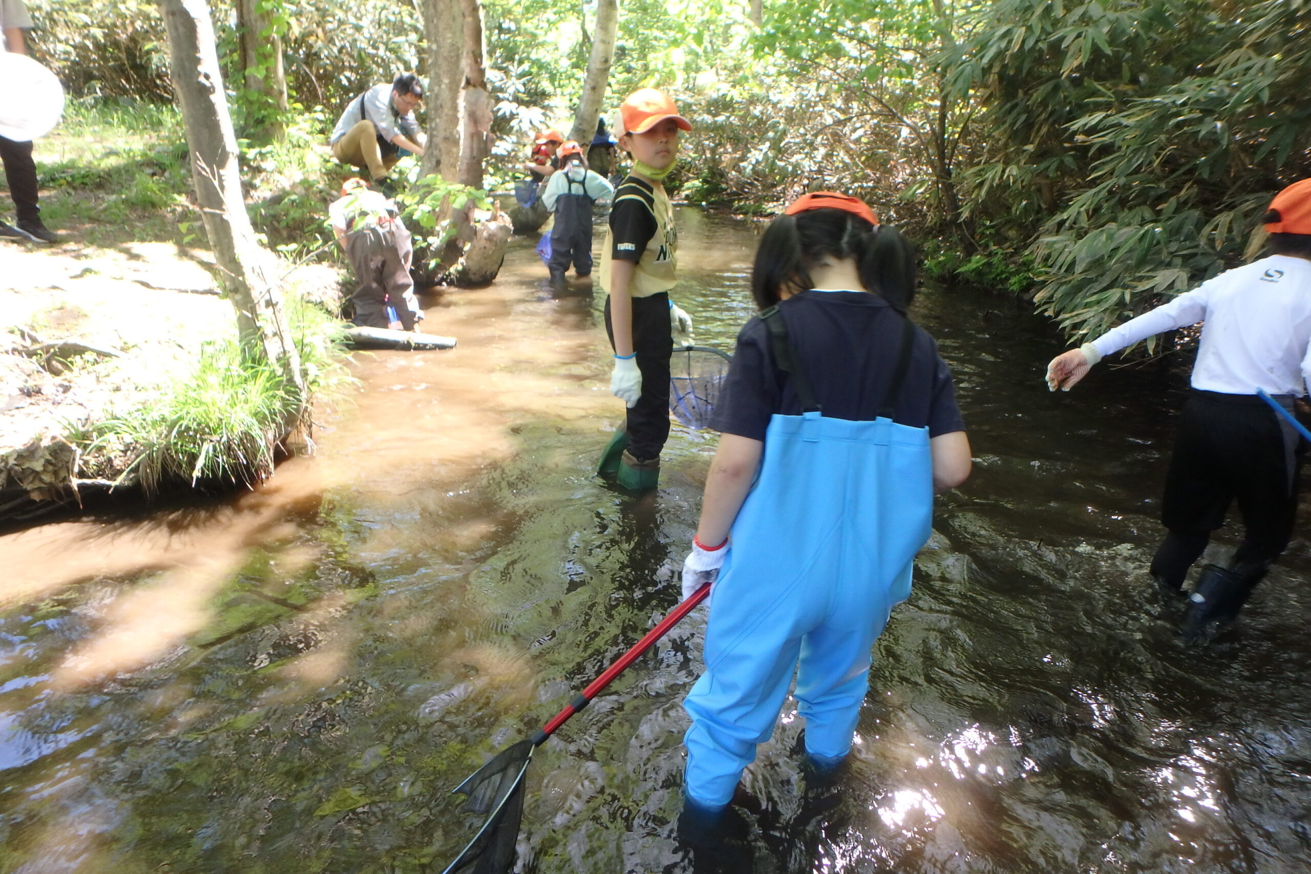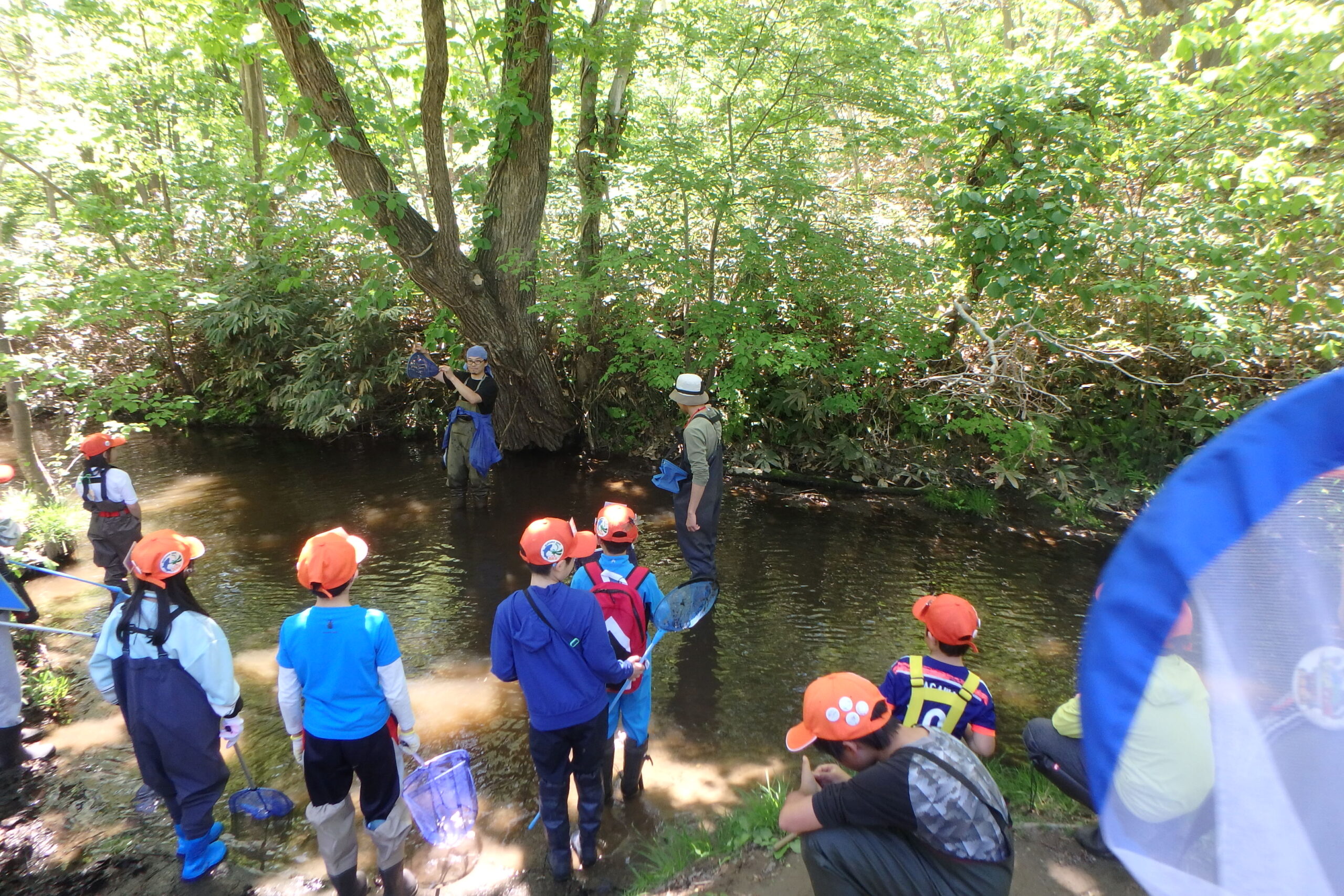 午後からはみんなで川に入って、魚の専門家のボランティアの皆さんにガサガサのコツを教わりました。