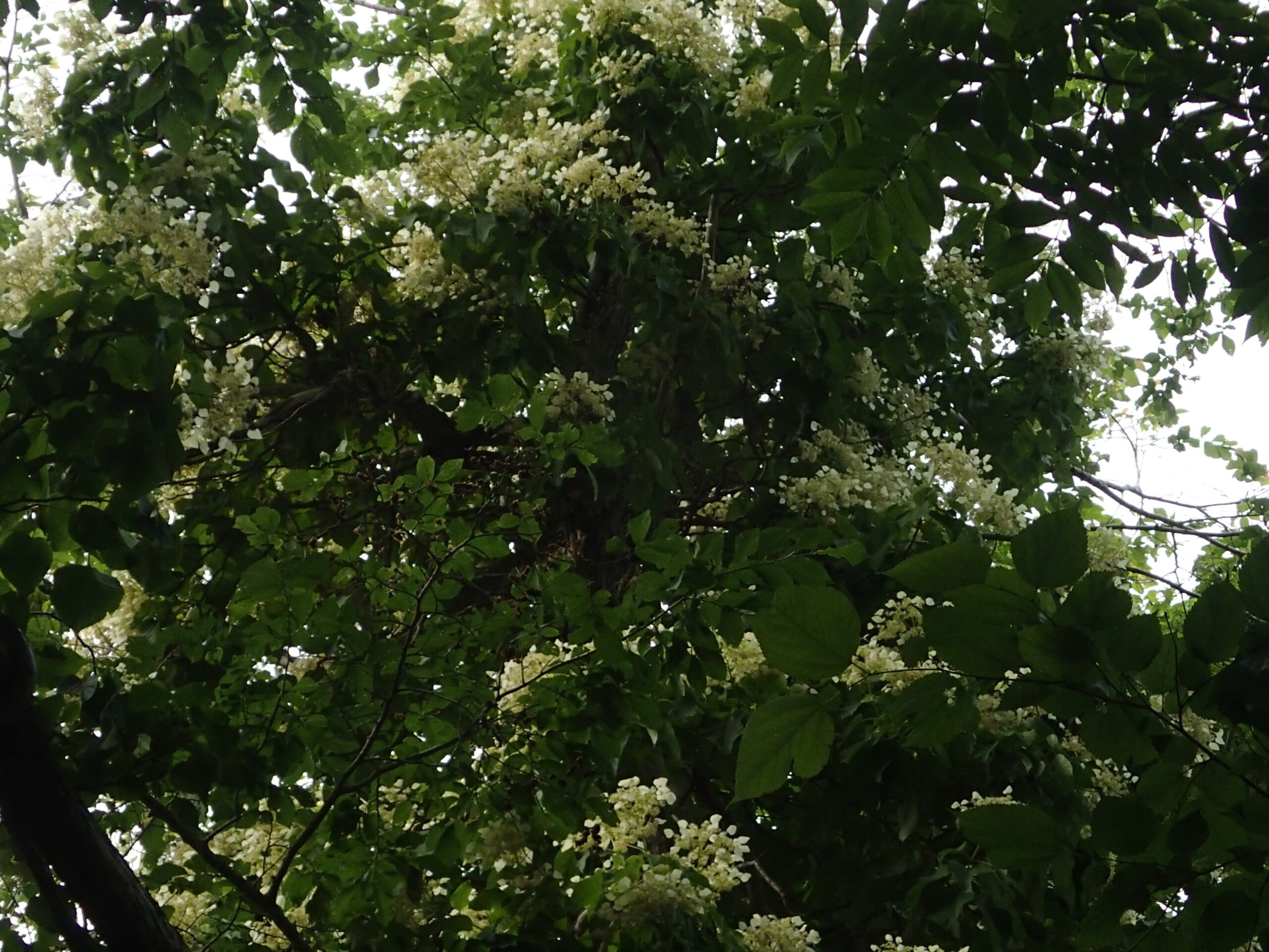樹を伝って高い所まで育ったイワガラミの飾り花が今年はいっそう華やかです。