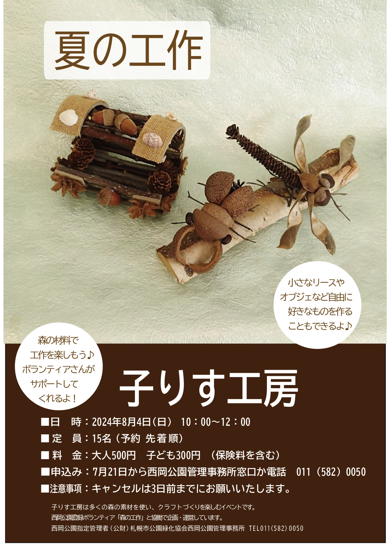 そんな西岡公園では「子りす工房」~夏の工作~を開催しますよ。