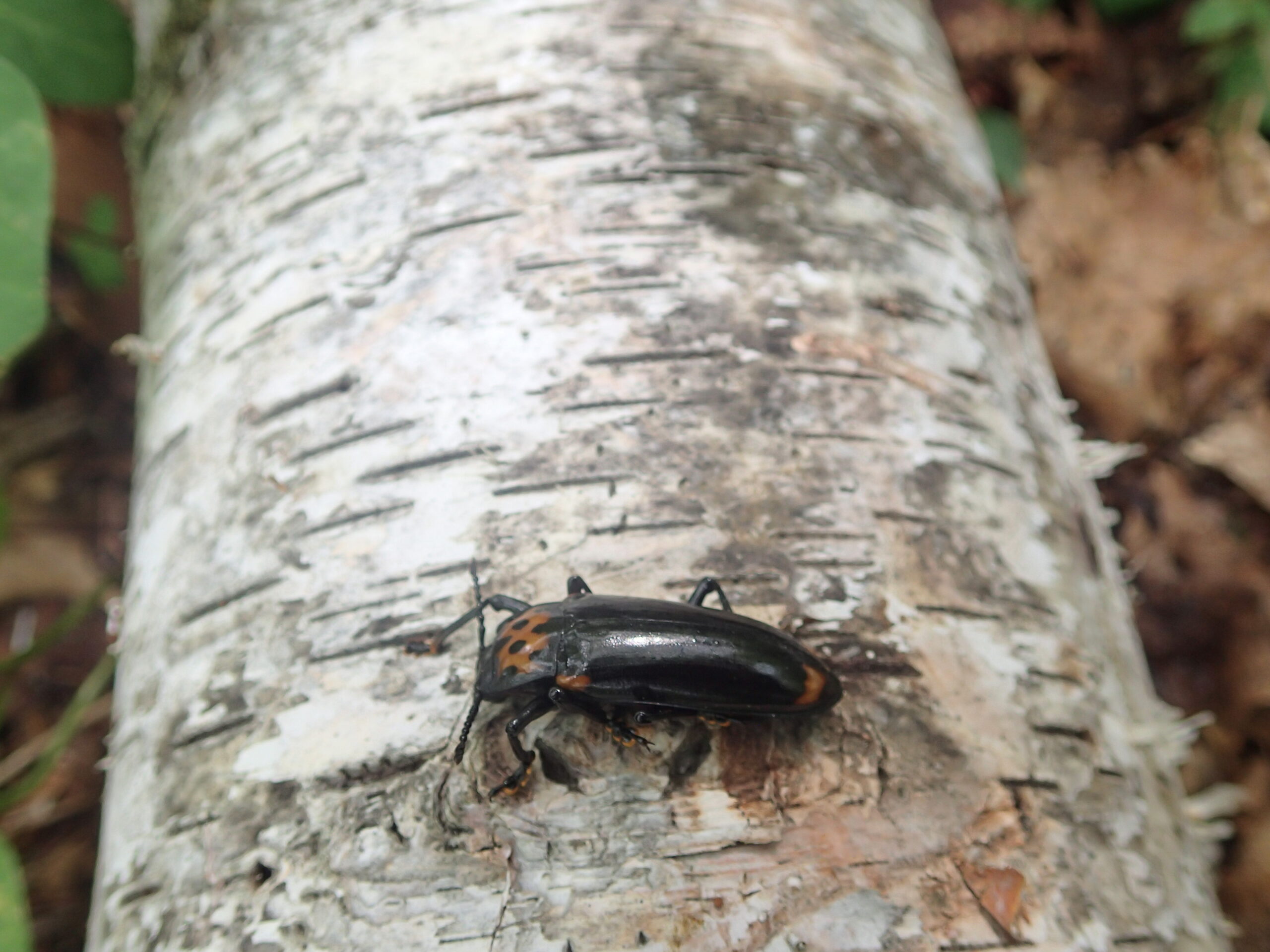 胸がオレンジ色に黒の水玉模様のオオキノコムシ