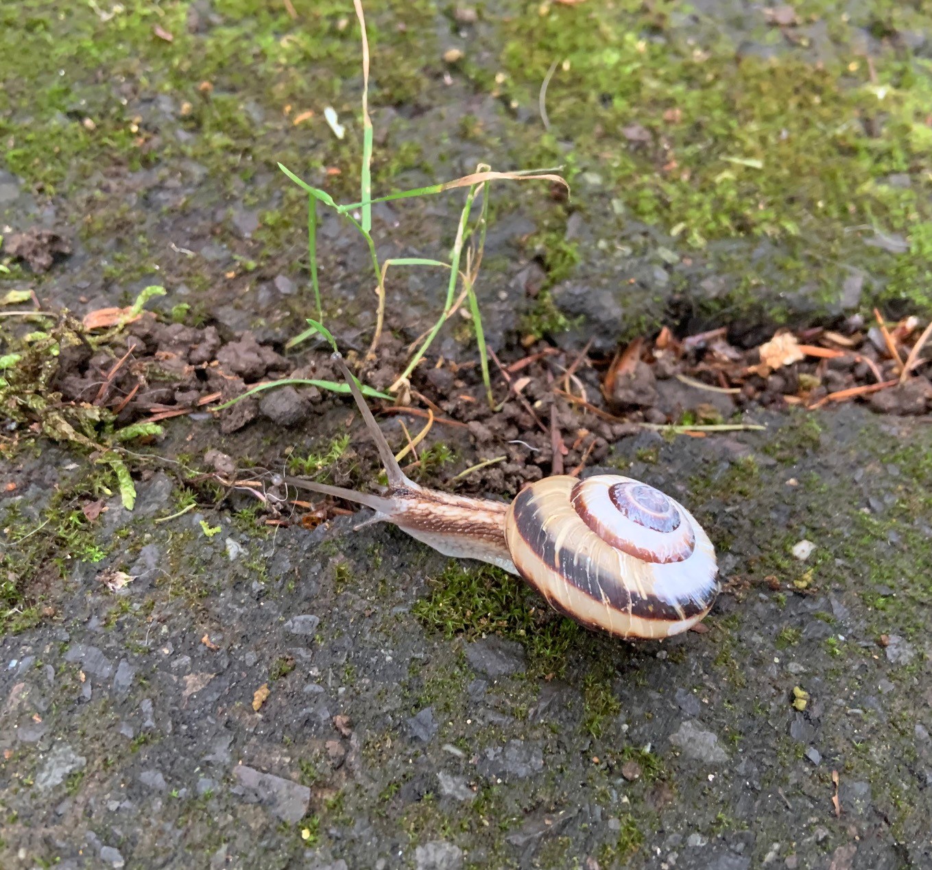 黒い太い渦巻き模様が特徴のサッポロマイマイも歩いています。