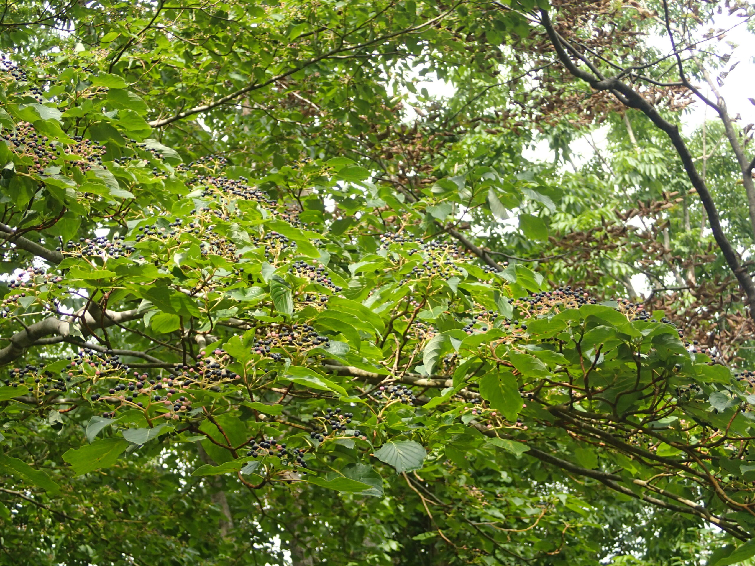 ミズキの黒い果実と赤い柄のコントラストが目を惹きます。