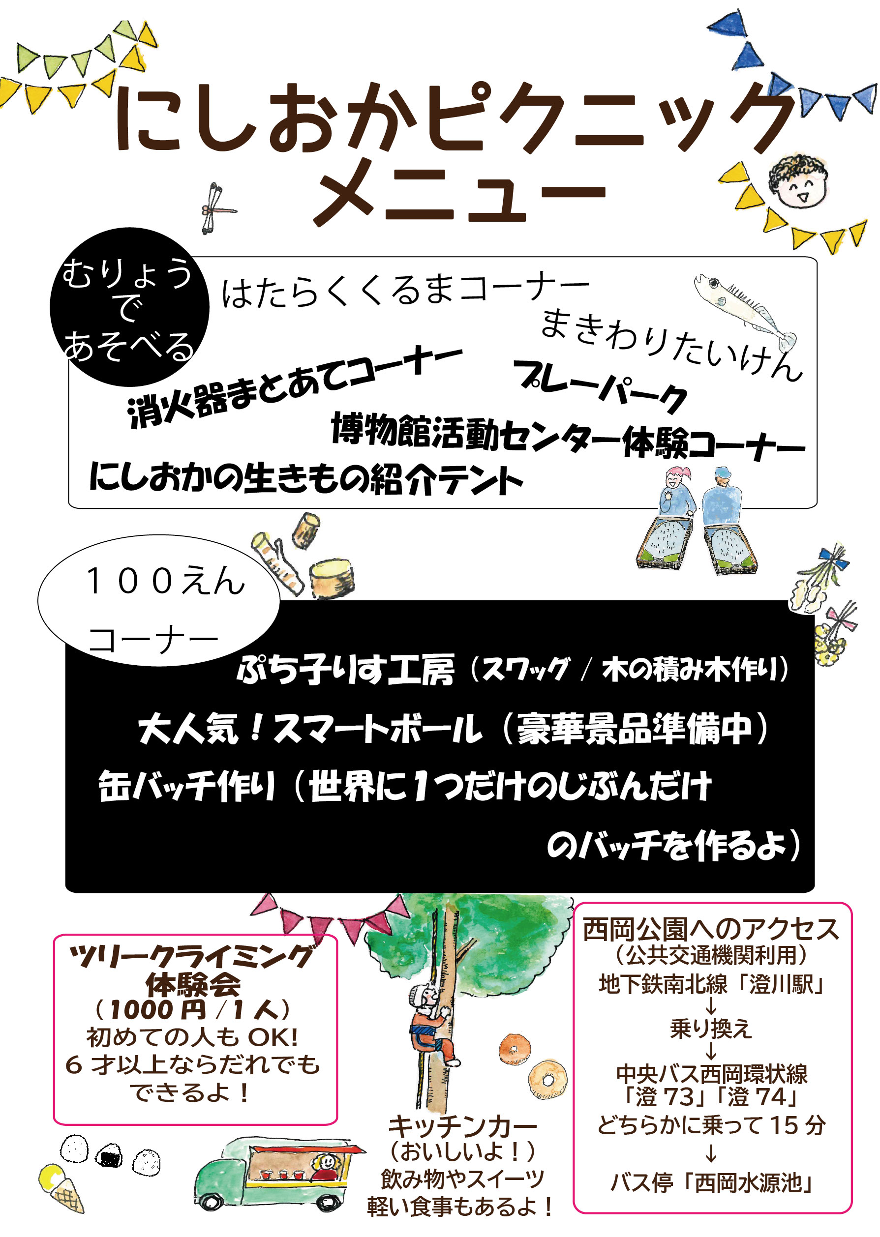 そんな西岡公園の秋をたっぷり楽しめる小さなお祭り「にしおかピクニック」を開催しますよ。