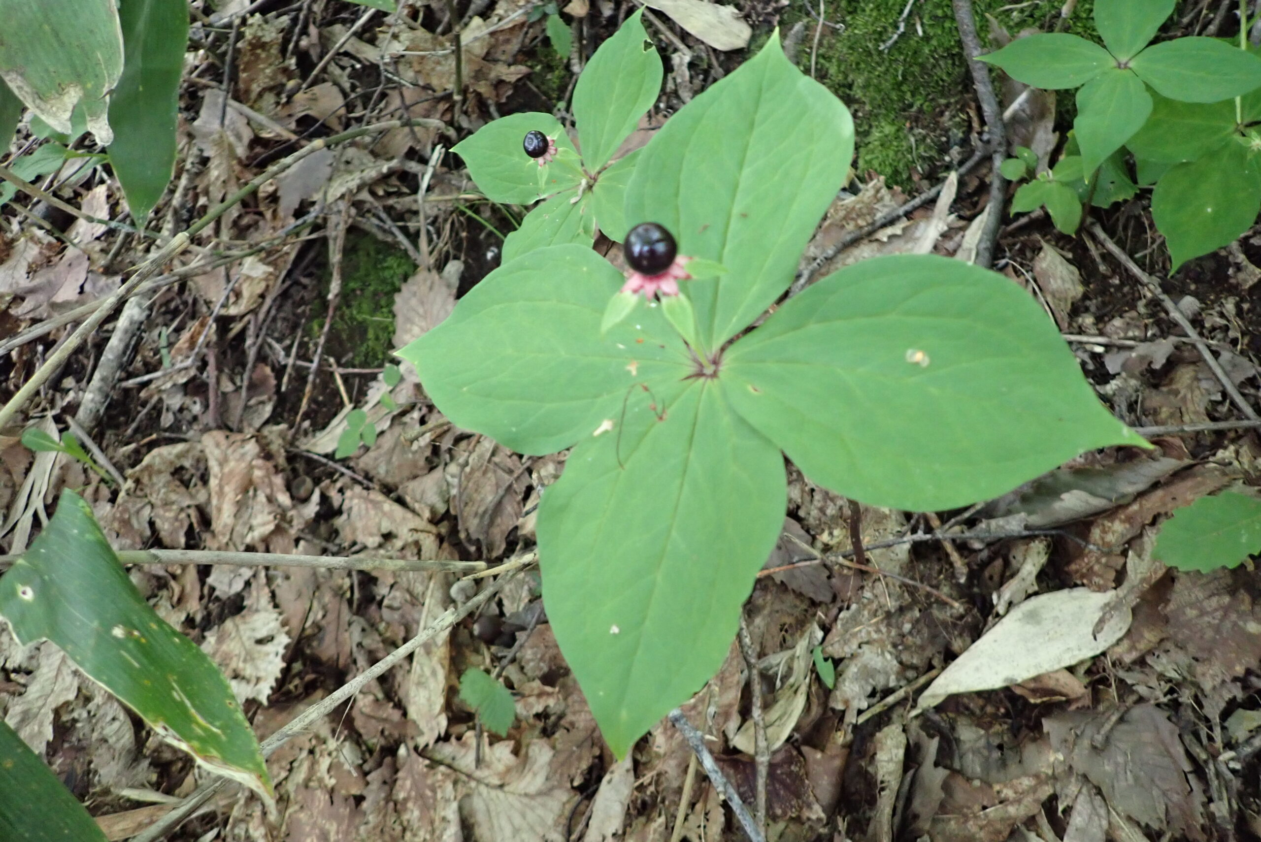 ツクバネソウのツヤツヤの黒い果実も実っています。