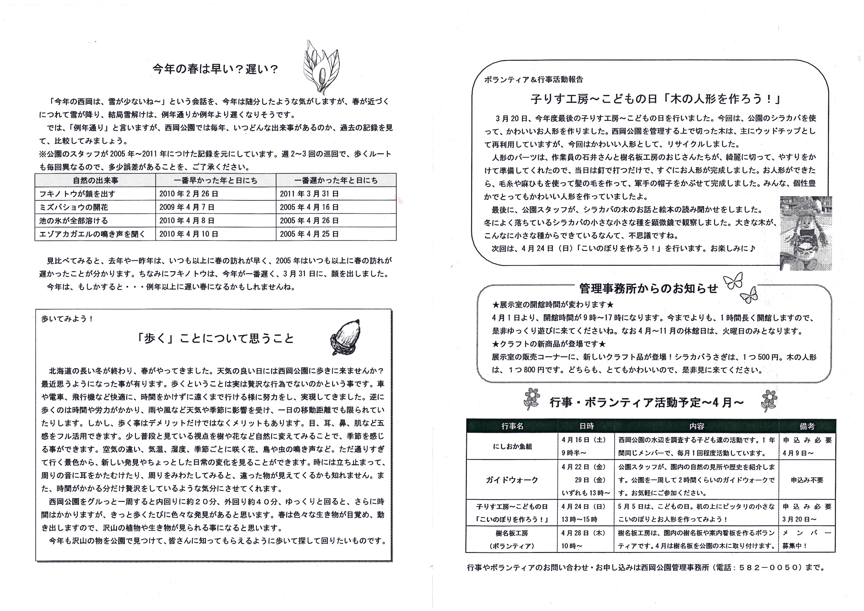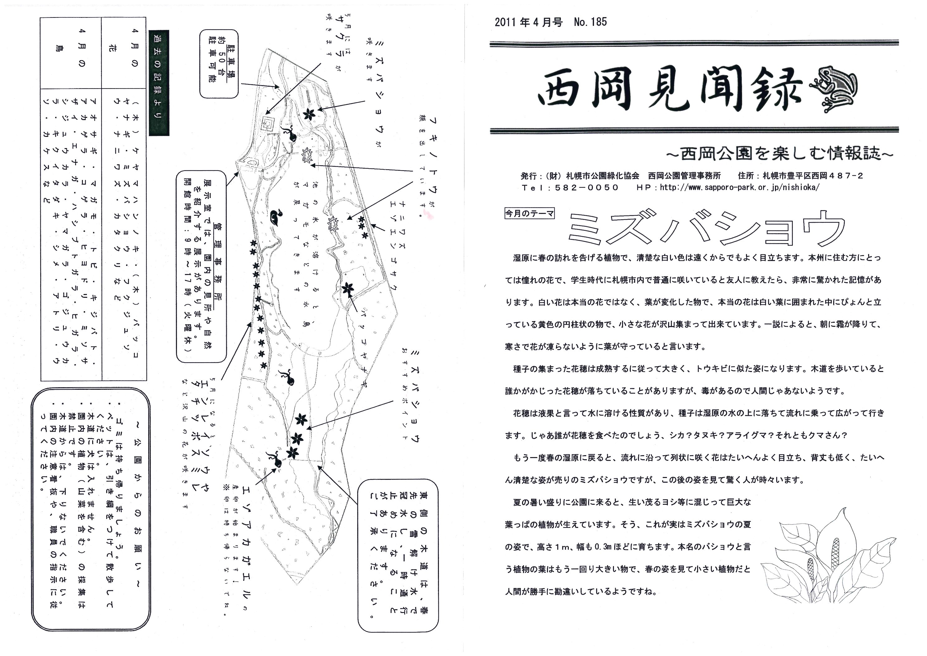 今月の見聞録は「ミズバショウ」についてです。ミズバショウは毎年4月に咲きはじめ、ゴールデンウィークまで楽しめる湿地に咲く花で、西岡公園では春の風物詩となっています。中では、雪解けの今までの比較や、子りす工房のレポートとなっています。