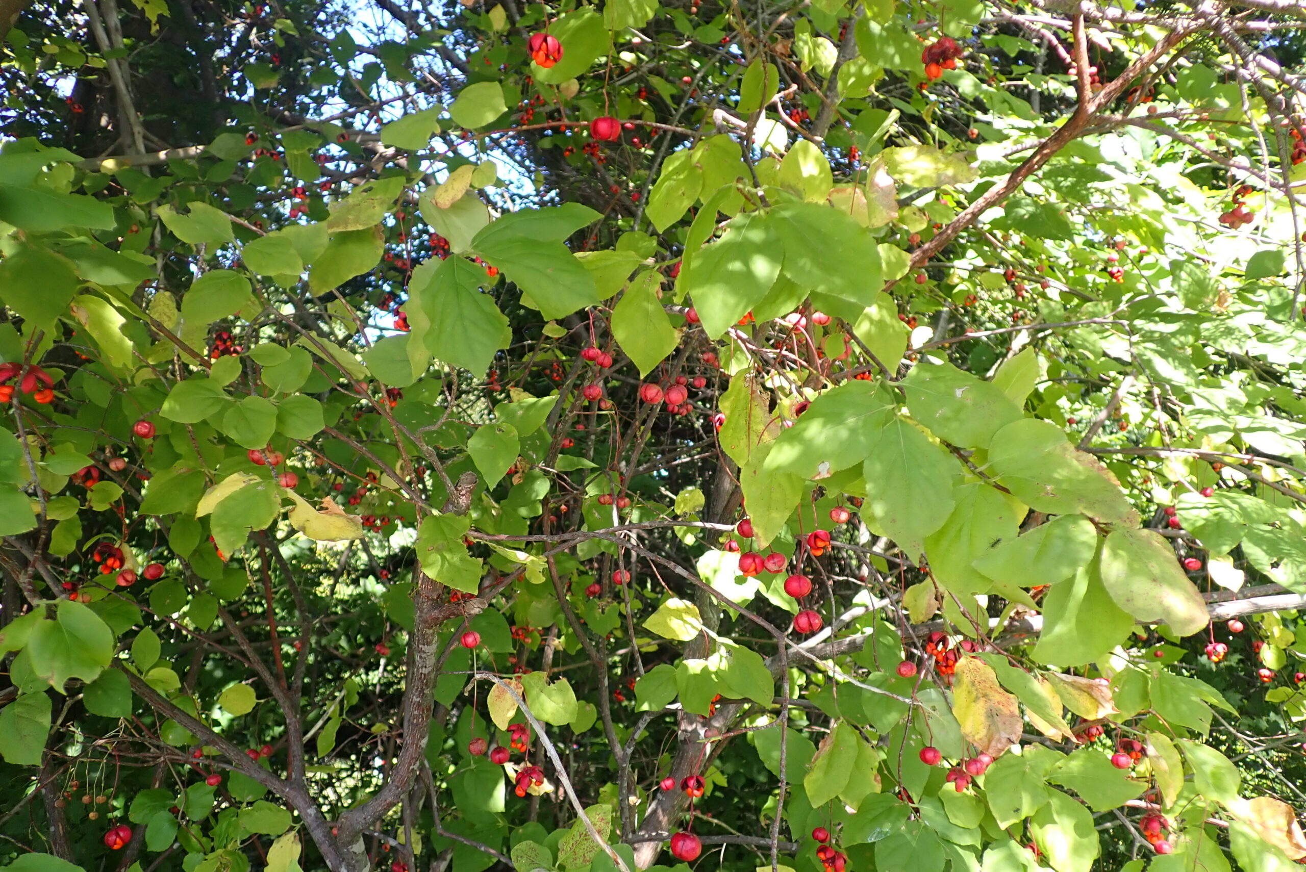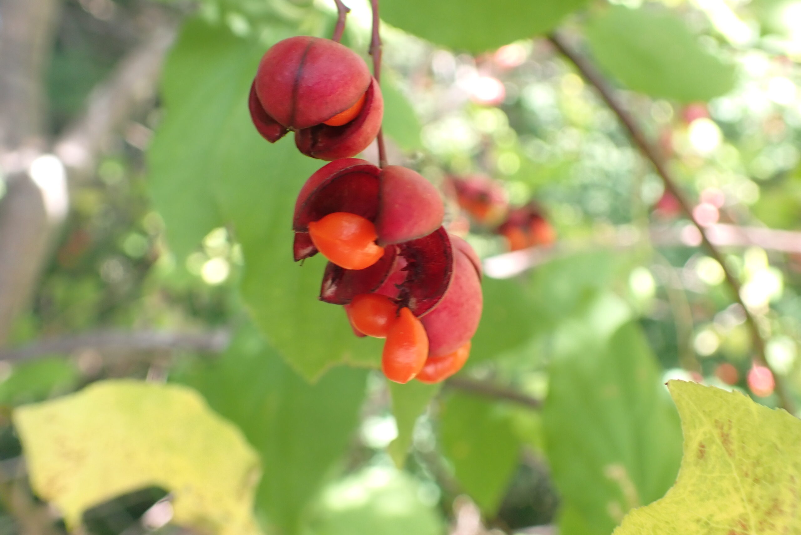 ツリバナの果実も赤くなり5つに割れています。