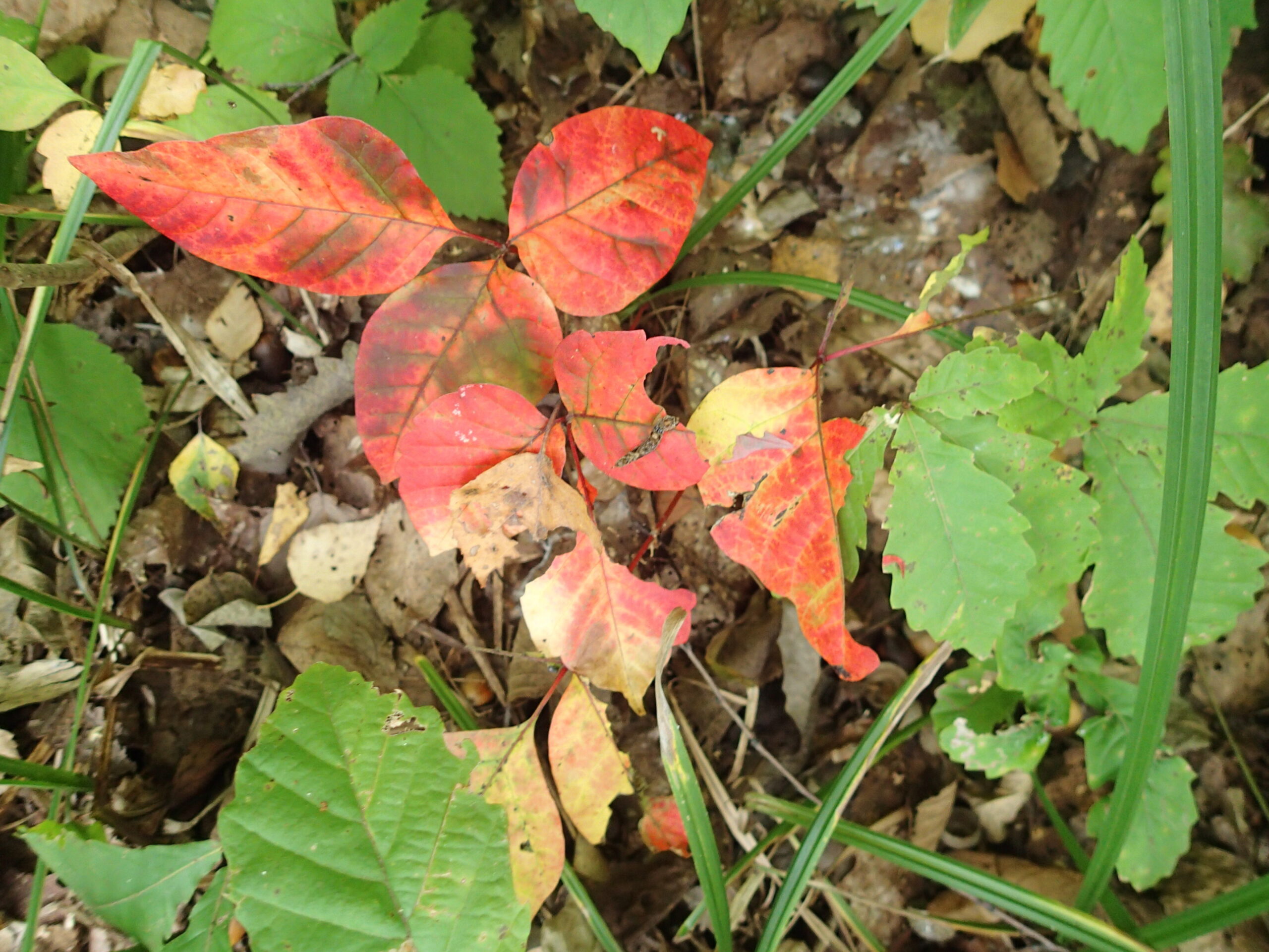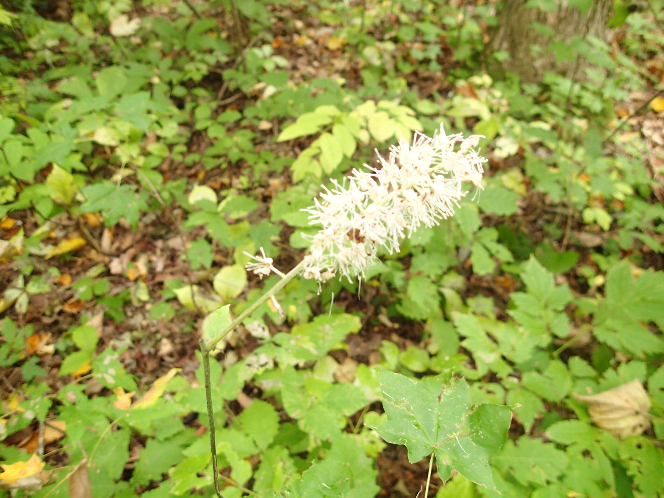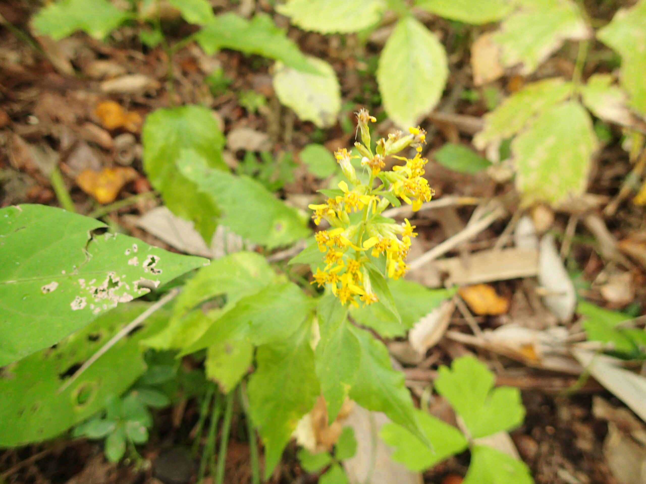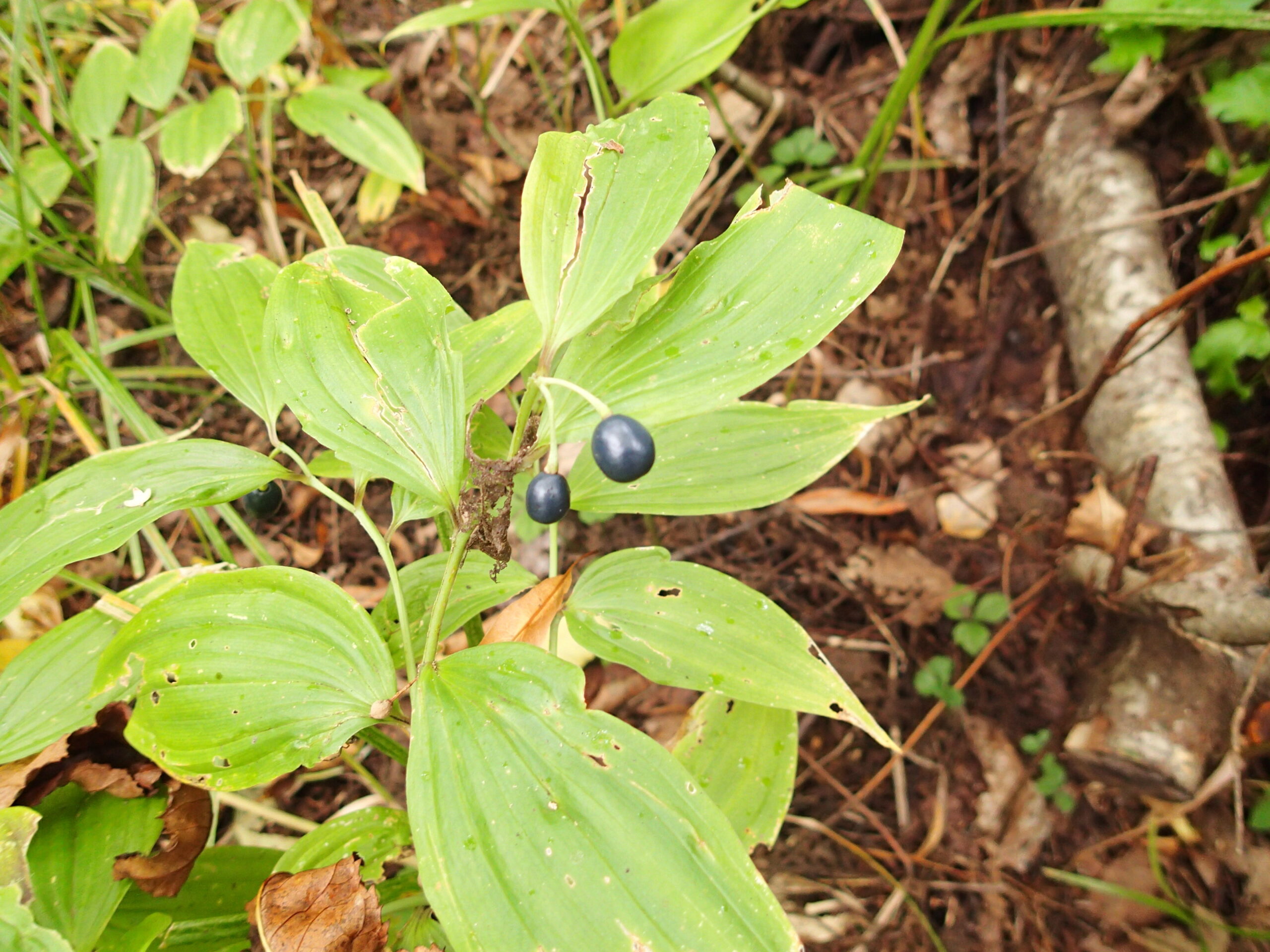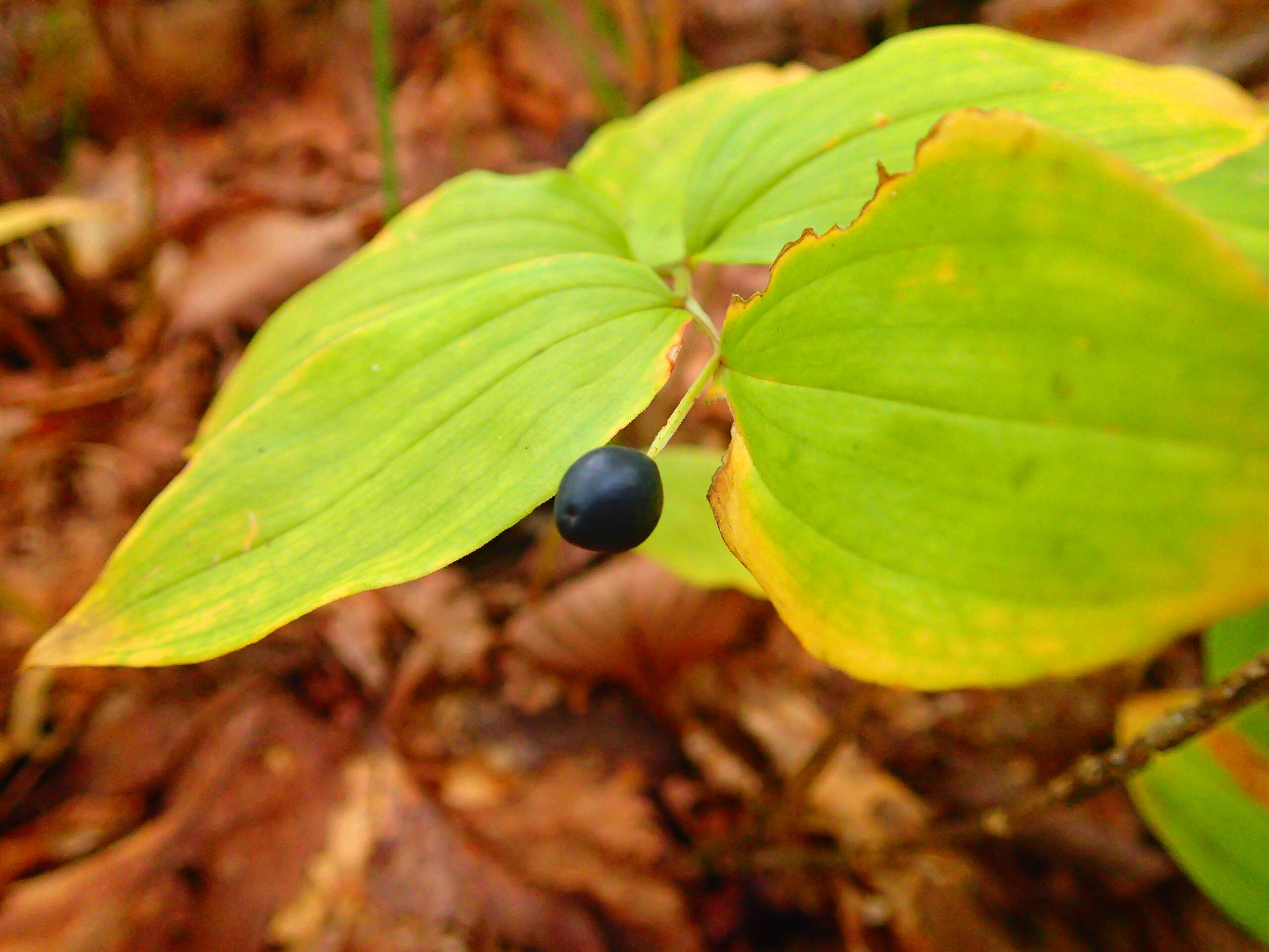 黄色く紅葉しかけた葉に黒いチゴユリの果実のコントラストが目を惹きます。